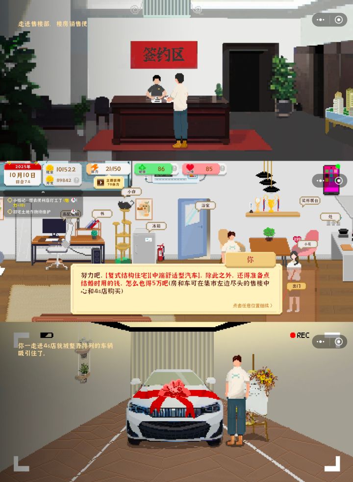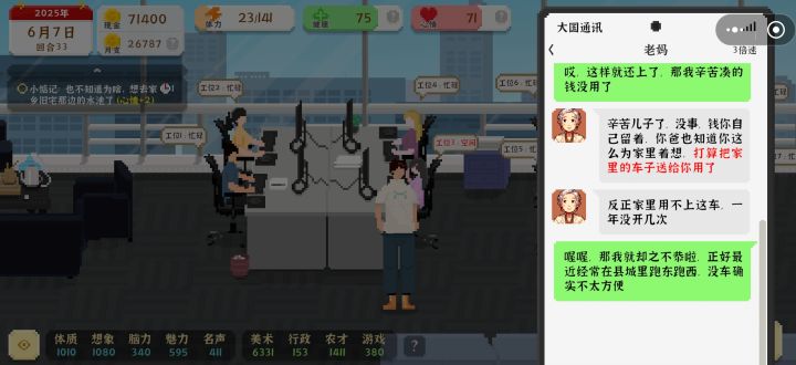 先说整体评价,还是比较满意的,经营养成类游戏 然后有相当于四个职业可以选和发展。我走的设计 农业 游戏三条路,本来10小时就可以结婚了,但是我自己犟想拿游戏世界冠军,硬多玩了三个小时。然后分享个我第一次通关的转折点:是父母任务 欠了70000块需要我们还 但是实际上攒够了也不用给他们,任务完成后七万块钱保留的情况下还送辆车 跑图直接0体力。然后七万块钱直接足够我们把公司和房子的所有设施全买了,因