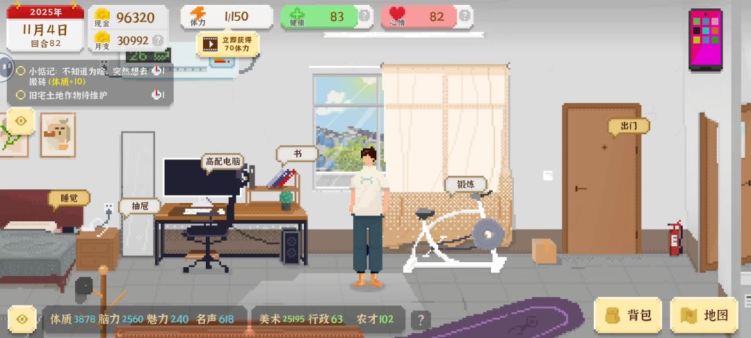 开局吃药,然后80体力干完一篇神作,锻炼一下,喝瓶可乐点个外卖(最好是豪华大餐),然后出门去学校,坐椅子上休息一会,然后就开始一直培训班,最后回家晚上熬夜刷会手机 (不下雨不停电的话,健康没有大餐就是不变,有大餐就是加二,下雨停电直接一直看书读就行,健康不够明天再跑步补上来)#我独自生活 #我独自生活娶艾薇 对了,记得选艾薇可以多加点美术