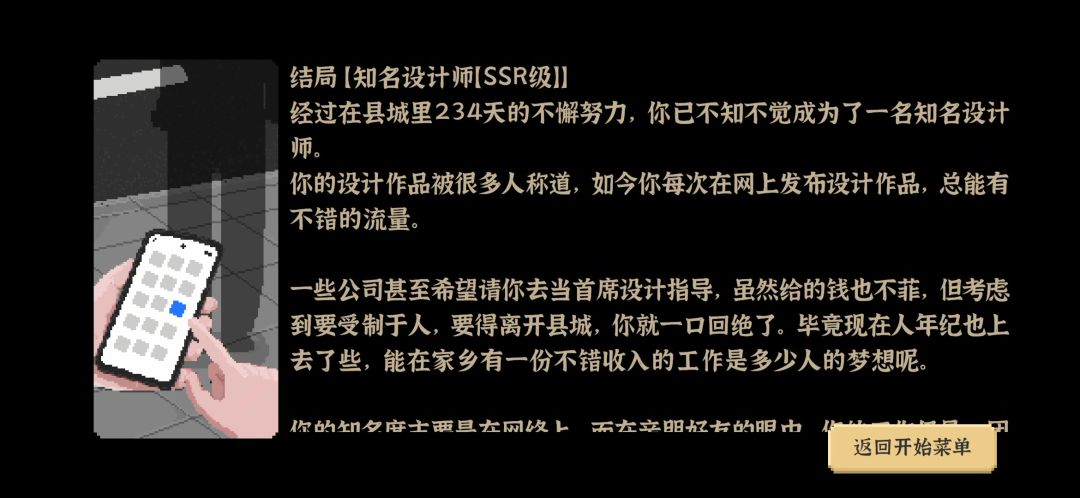 耗时5.7个小时,73周,第一次玩第一次通关,燃尽了孩子们!虽然删过一次20回合的存放[表情_开心]但是不重要!!!真的,如果游戏设计者把攻略角色的对话多设定一些比较好,不然一直重复那几个玩家都觉得没意思了,好感刷够了也就不理睬,如果能加一个突发事件(任何事件)或者好感值会掉,给游戏加一点挑战性。 总之呢,体验还不错可以给到4星#我独自生活娶艾薇