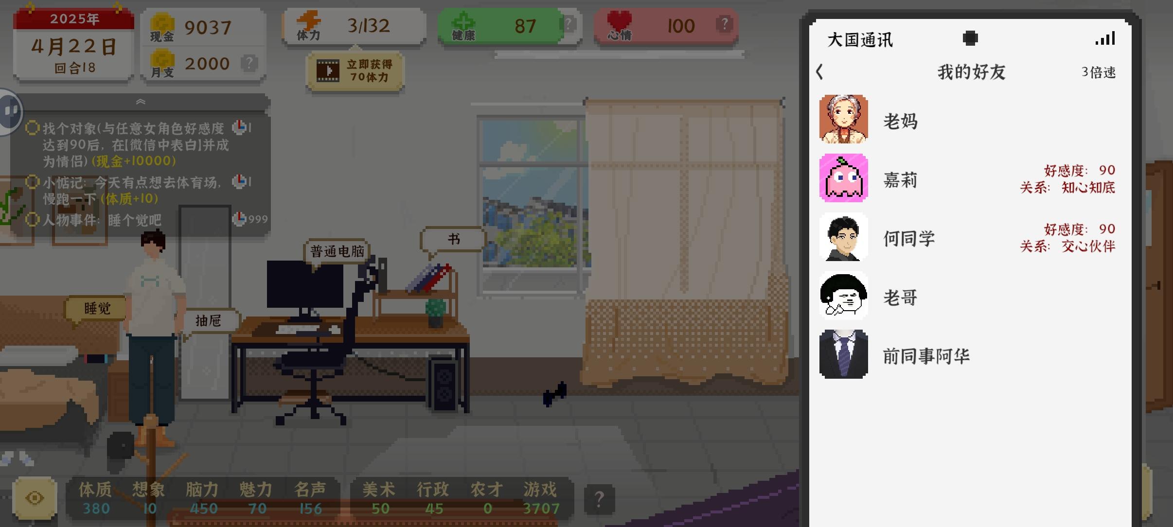 第一次玩这个游戏嘿嘿,我这第一个档70回合就有车有房有老婆还上岸了算不算快的了嘻嘻。虽然说错过了老爸送的神秘大奖(就是15回合攒够7万块的任务😭俺拼了老命才凑了六万多)后来看攻略才知道奖励是辆车好像。不过玩的还是挺开心的嘿嘿(๑•ω•๑)感觉上手难度不高,像我这种喜欢雨露均沾的全面流也能玩的挺开心~唉要是现实生活也能这么容易赚钱就好了😪