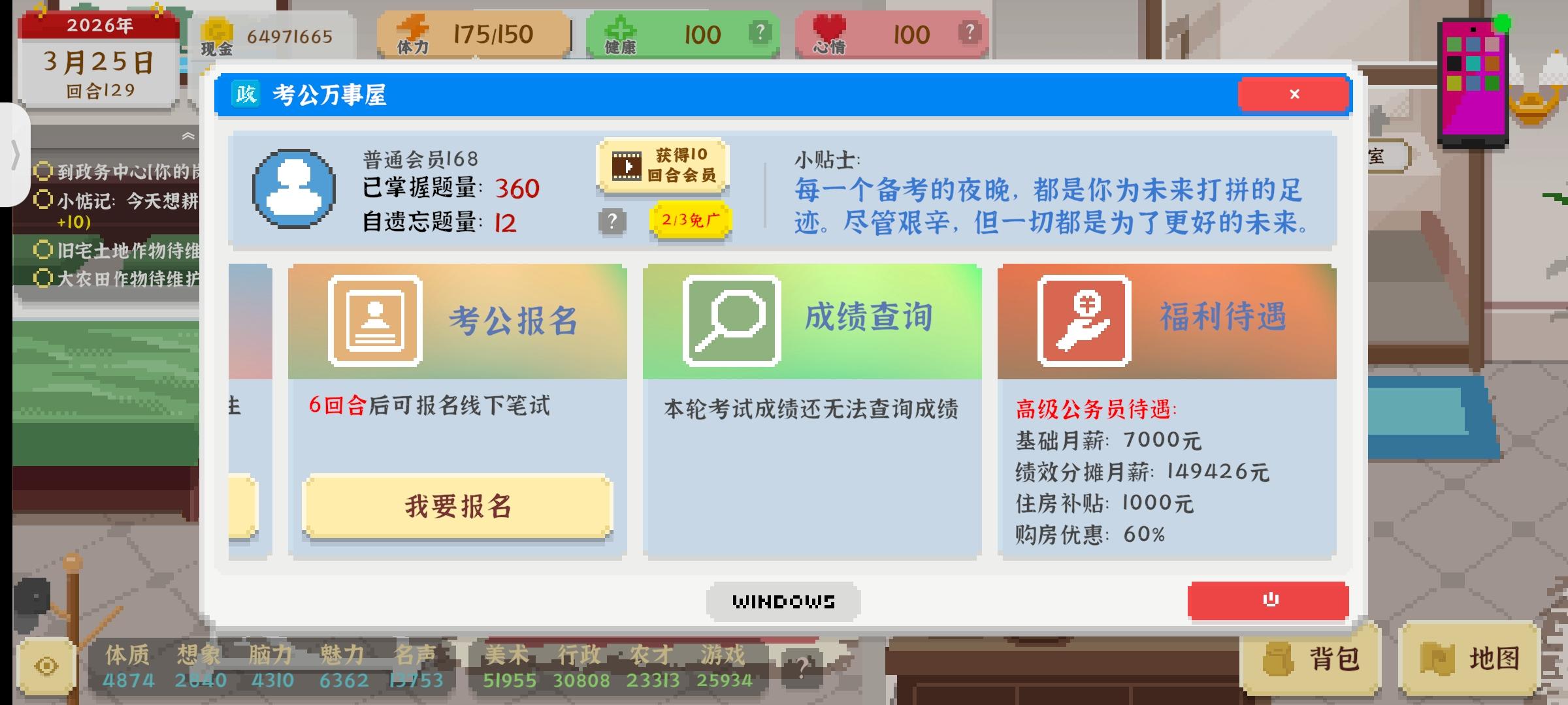 第一次玩这个游戏嘿嘿,我这第一个档70回合就有车有房有老婆还上岸了算不算快的了嘻嘻。虽然说错过了老爸送的神秘大奖(就是15回合攒够7万块的任务😭俺拼了老命才凑了六万多)后来看攻略才知道奖励是辆车好像。不过玩的还是挺开心的嘿嘿(๑•ω•๑)感觉上手难度不高,像我这种喜欢雨露均沾的全面流也能玩的挺开心~唉要是现实生活也能这么容易赚钱就好了😪