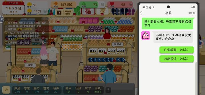 我靠,我是真难受,第一次玩开局不到五回合老妈告诉我老爸生病了,要二十万要在二十个回合内筹齐,我拼死拼活挣了五万,眼看就快到时间了没筹齐,就怕会解锁什么坏结局,天天去买彩票,中了二十万,结果她后面告诉我有人捐赠了,不用我筹了,那我那么多天健康在六十边缘徘徊干什么🤡但是聊天记录翻不到了