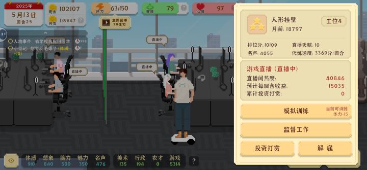 首先是体会:刚开始玩的时候三次全死于猝死(身体的本钱),这第四把就注意吧健康维持在80以上,解锁写字楼后,能开工作室了就得开,自己接单是真的伤身体,等后面自己偶尔接接还不错,反正我后期一个1w一个3w一个10w共三个作品的超出还不如后面一场直播挣得多,所以设计终归小道,前期铺路就够了,可以从政最高只能到高级公务员,我还想胜天半子呢最后是建议:1.建议官方增加节日之类的内容,像春