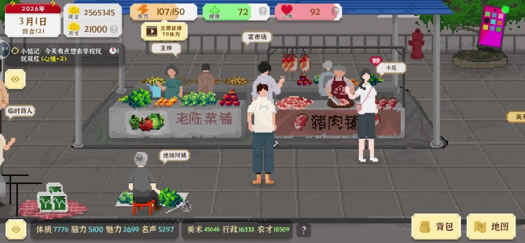 第一次玩,到了100回合,UI设计老板,农民,公务员全体验了一遍,最后留下存款200万和做好的车房与小花结婚,到后面太乏力了。期待更新内容