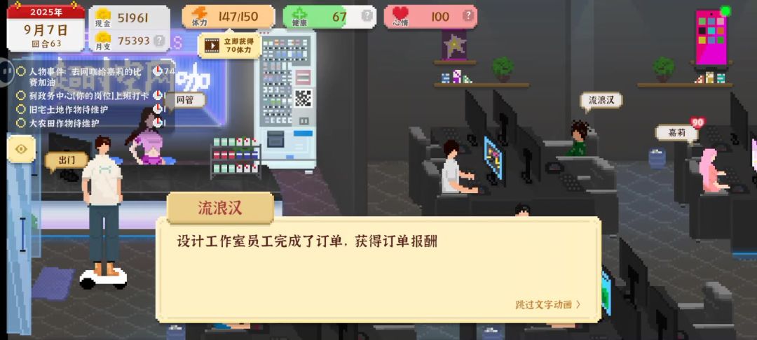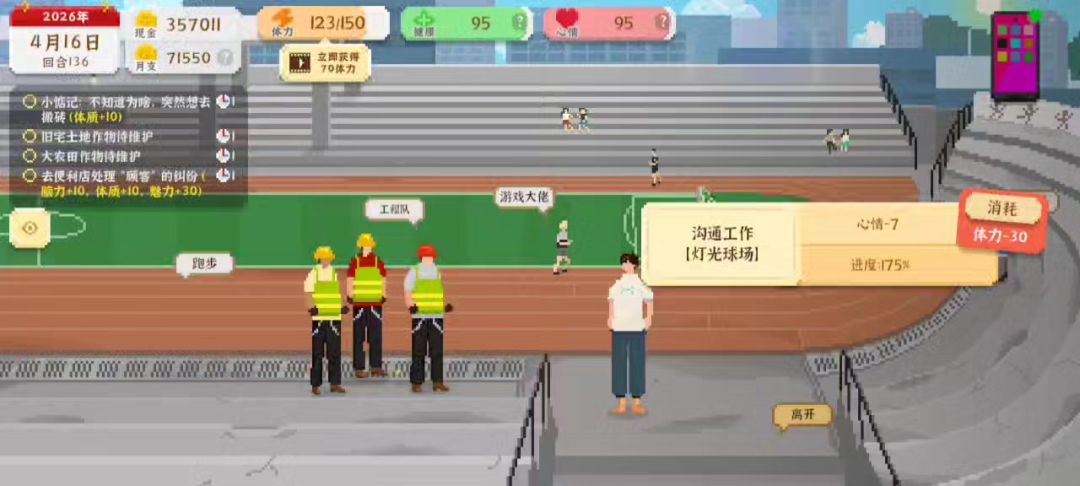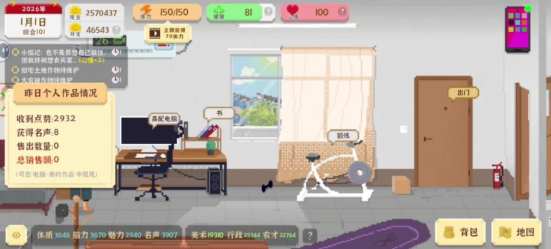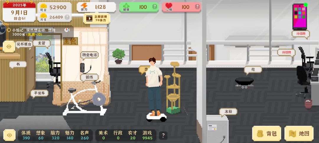 分享一下吧,健康和心情基本都在高中打球恢复,没体力了坐椅子或者拉杆,偶尔去网吧玩玩,每天起床就是挣钱,后期去考公直接最高级,希望作者能出个婚后生活还有和人物的聊天对话,太枯燥了,每次聊天只有那么几句,最后就是有个小彩蛋,作者叫盒子,游戏里男主把朋友叫何子,不知道友友们发现没有,总体还是挺好玩的,时间杀手,玩久了有些枯躁#发现好游戏 #我独自生活 #经营类游戏