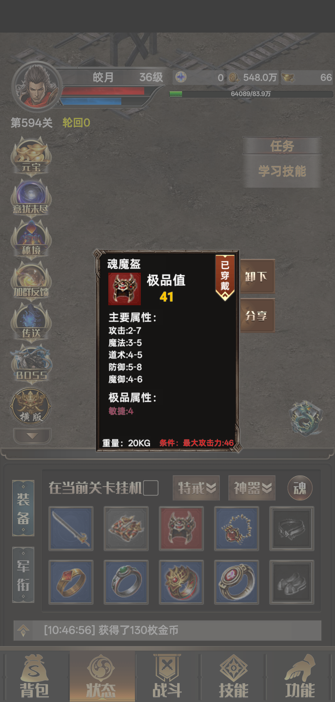 无礼包无福利最佳开局、哪里爆装备见上图Q群文件夹有最新安装包在Q群、tap下载安装包相同,和苹果平台不互通0、职业法师暴力,前期脆皮,后期很强大战士中庸,不好不坏,没有优缺点道士磨叽,想死很难,但玩着想死1、推图第10、30、50、100…以后每50关出现三选一属性框,✔后自动选buff,每1500关无属性选择,但会出现年兽,打死年兽后可以进入下一轮回轮回只能将元宝、军衔、三选