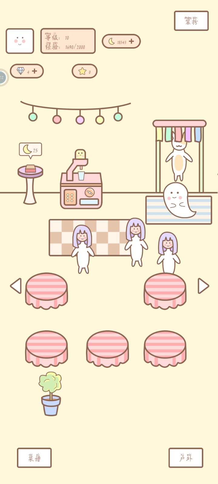 1.购买商品的时候只能一个一个买,建议可选择数量,而且有时候点商品没反应2.客人吃完离开的时候是倒着走的,很奇怪,建议正常出门3.小鸡仔都长一样,喂食、升级、下蛋根本区分不了,建议外表可以个性化一下或者标号4.外卖界面没有单子了(图一)5.装扮的界面很冗长,建议可以分类一下