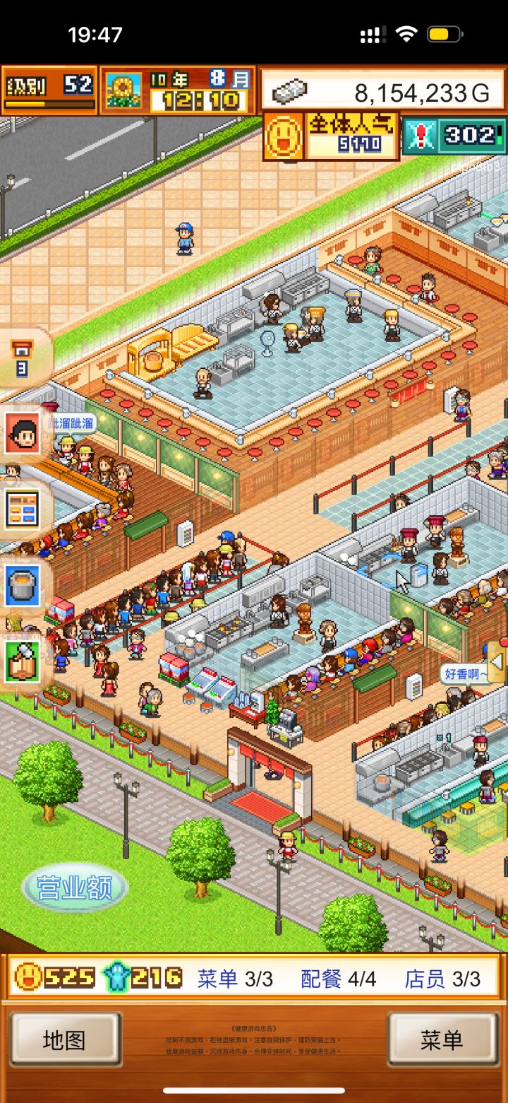 不足:到后期就有点无聊了,可能就是纯肝,内容比较单一。但是都后期了,要啥自行车。还有一点就是,厨师的厨艺在后期没有究极升级书的情况下很难升上去(而且有的用大师也升不上去),这样有些拉面难度高依旧只能放在仓库不能出售。那个降低难度的材料一个只能降一点点,玩成了数据游戏。还有就是那个角落里的图层复制建议官方修改一下,给人看的不舒服。