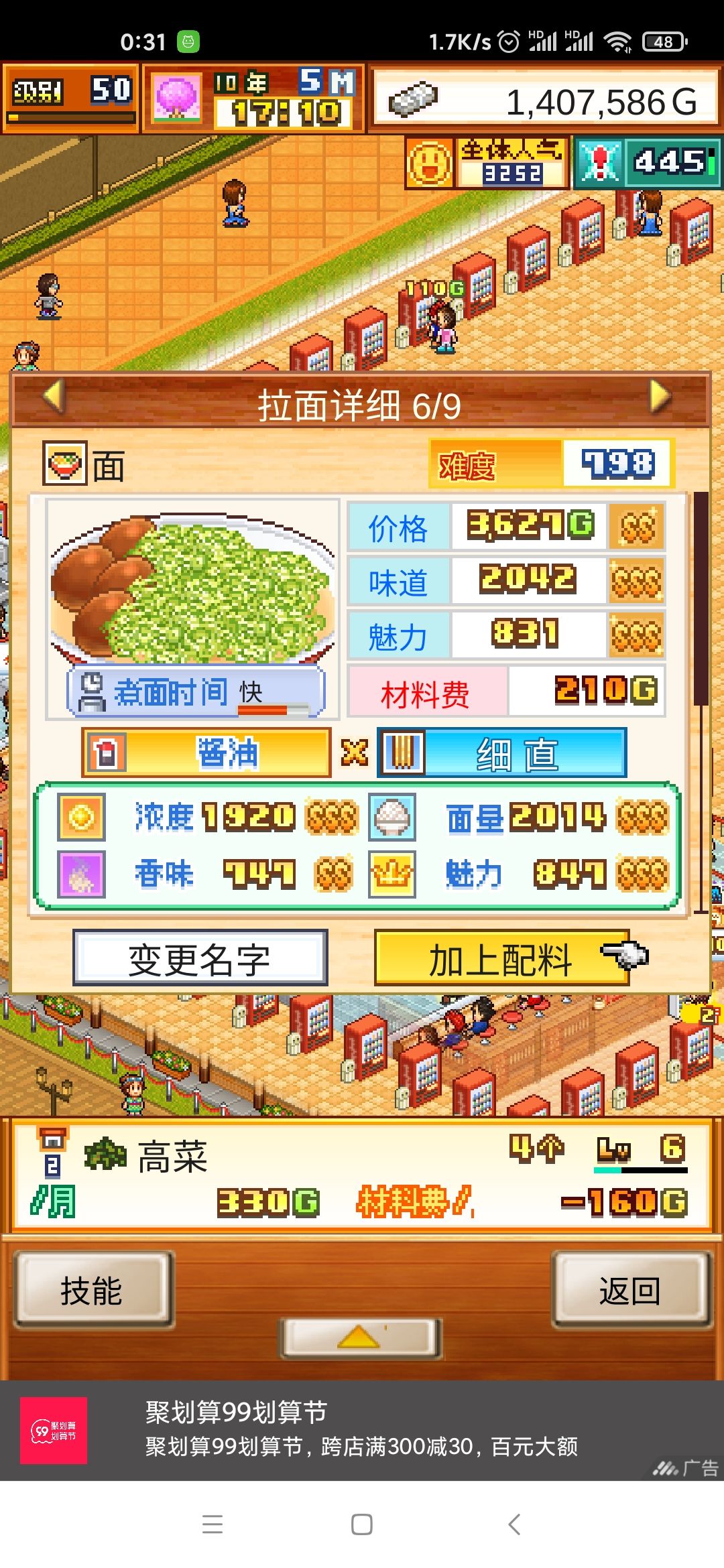 我们直接进入正文 ①明确游戏目标 我们首先要知道,这游戏是经营类游戏,没有结束的那一天(也是有的,但这个游戏的结局只是记分,无作用)。大家都可以把十段设为自己的目标。或者是把面评价为SS为目标,一切都看自己。不然玩不下去。然后得清楚如何向目标前进。 自己好好想想,之前做面差什么? 然后,想想游戏主线是什么? 赚钱,做更好的面。再赚钱,再做更好的面 ②关于做面 目标 无汤不成面,无面不成汤。要做出S