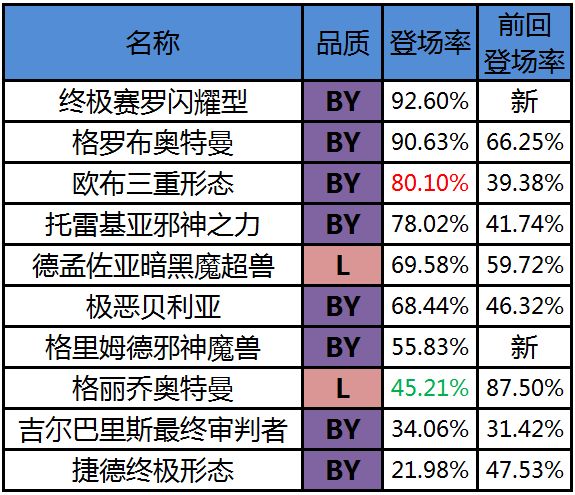 第六届宇宙巅峰联赛圆满结束。 由于这次的宇宙联赛是全服范围,所以更能体现出此次跨服战的冠军含金量。因此各路大神大显身手,争夺名次,为了竞技巅峰的称号奖励,大家都鼓足了干劲。 那么依照惯例,一起来看看这期的胜者吧。 巅峰赛三强: 明星赛三强: 恭喜上榜的英雄们,你们都是光之国的骄傲!!! 一、数据分析环节 (登场率上升最大的角色用了红色字体表示,登场率下降最大的角色用了绿色字体表示) (注:终极赛罗