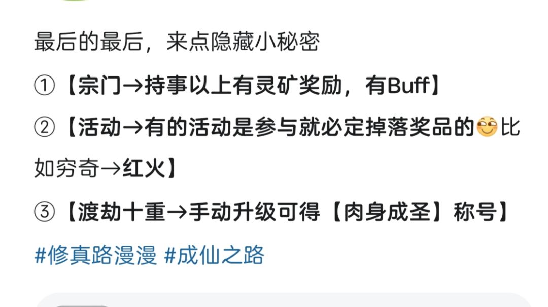 我先说一点,游戏是多样性的,攻略是死的,看每个人理解 就好像我教你存功法残卷存着换紫色,你嫌前期被揍,你换蓝色功法,后期人人都出紫色功法你又觉得落后了 我这里先给个总结 游戏渡劫机制本身就是给落后的玩家追上来的,其次后期修为要很多才能突破渡劫了,一个月后基本上没什么差距的,放宽心随便玩,熟悉熟悉,自己靠着自己的游戏理解去玩。 所以综上所述,如果给游戏固定死的攻略,游戏就是不是游戏了,失去了多样性,