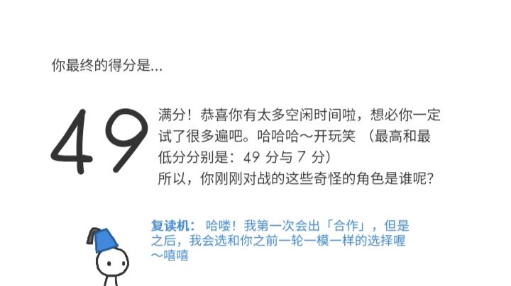 三年前的时候曾玩过一次,如今再次捡起,依然颇有趣味,于是有了些碎碎闲感:1.黑帮老铁是个“恶意检测器”吧😂,只要对方有一点通过背叛获利的想法,都再也无法达成合作。所以无错误率的情况下,能与黑帮老铁达成合作的只有黑帮老铁、小粉红和复读机复读鸭。这样人如果个人能力很高,基本不需要合作才能求生的话,对环境里的老油条、福尔摩,一根筋的空间是能起到压缩作用的。虽然黑帮老铁达成合作的总概率低,但是对环境确