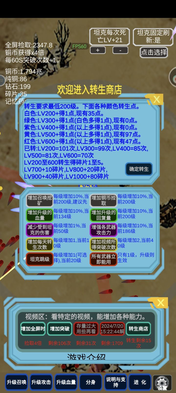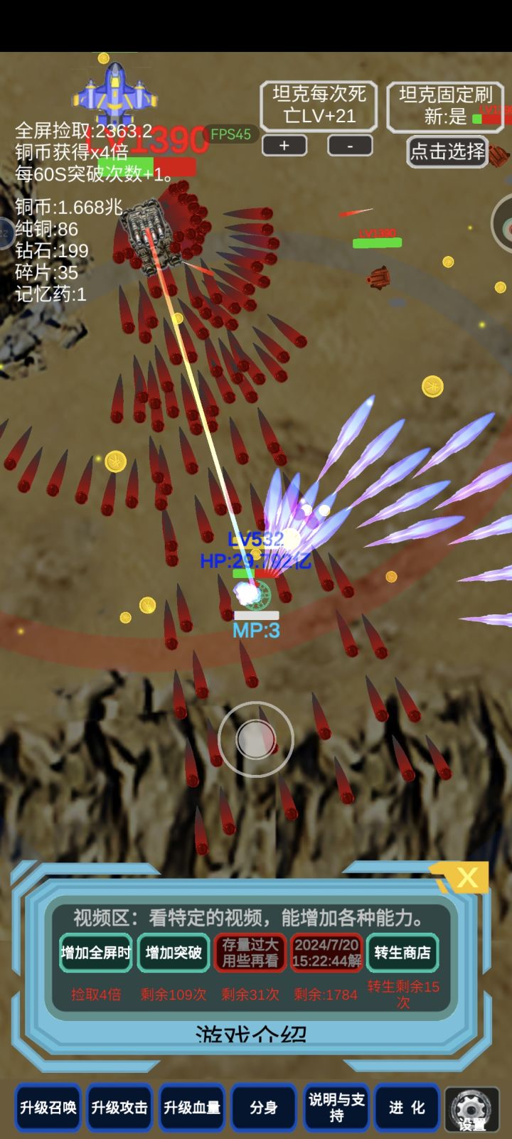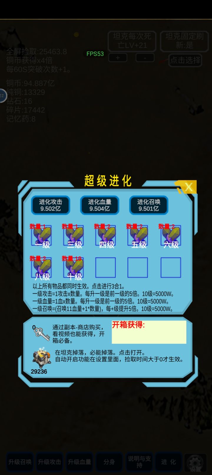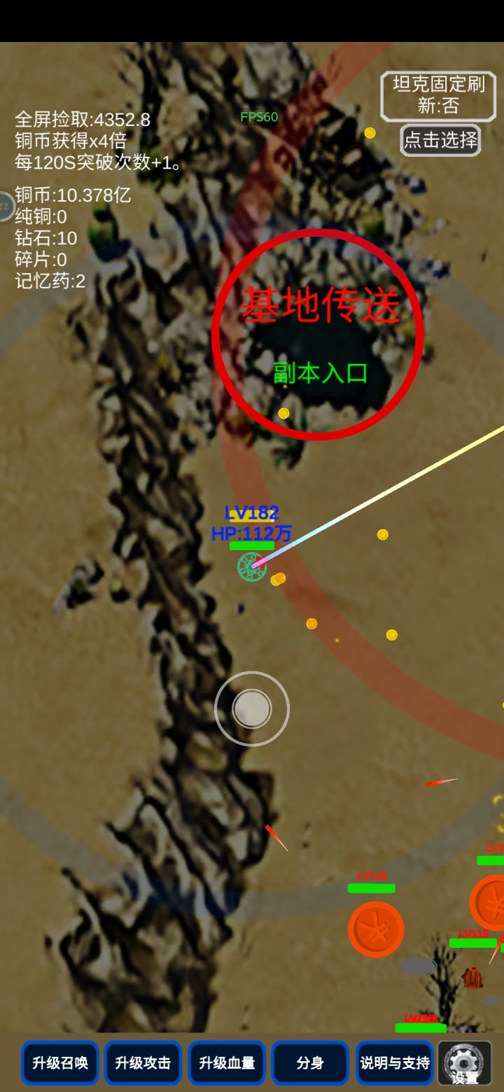 1. 前期发展:设置与开箱子:游戏刚开始先点击设置开箱子,箱子能提供金钱、血量、回血等方面的提升,尽量将这些属性提升到较高等级,比如各一万级,为后续发展打下基础。快速升级:将自身等级尽快提升到80级,可利用技能分身来加快赚钱速度,因为有了足够的金钱才能进行后续的各种升级和购买操作。选择合适武器:优先选择电链武器并进行升级,它能在前期提供较高的伤害输出。坦克转生:坦克达到200级后马上进行转生