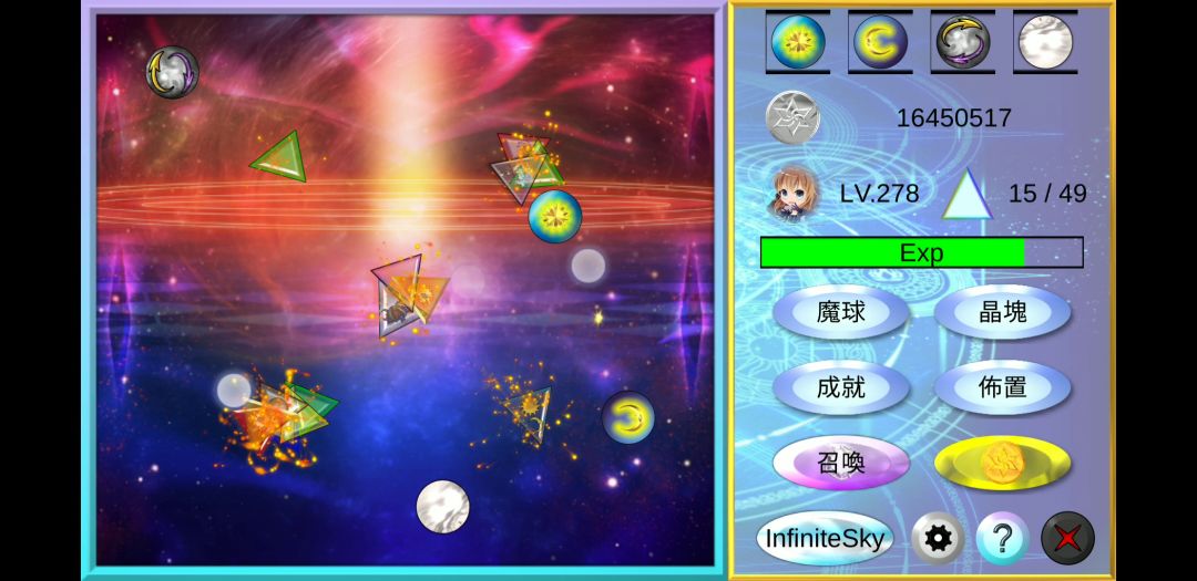 1.5- 修復小問題1.4- 增加百連強化1.3- 解決遊戲晝面卡住問題1.2- 玩家等級上限設置:10000(1萬)- 金錢元素上限設置:20億- 魔球晶塊等級上限設置:50000(5萬)- 部份背景音樂更換- 新增魔球 晶塊 成就 仙女召喚- 增設元素精靈百連召喚- 仙女召喚開放條件:玩家LV.200- 額外金錢由影片廣告改成插頁廣告