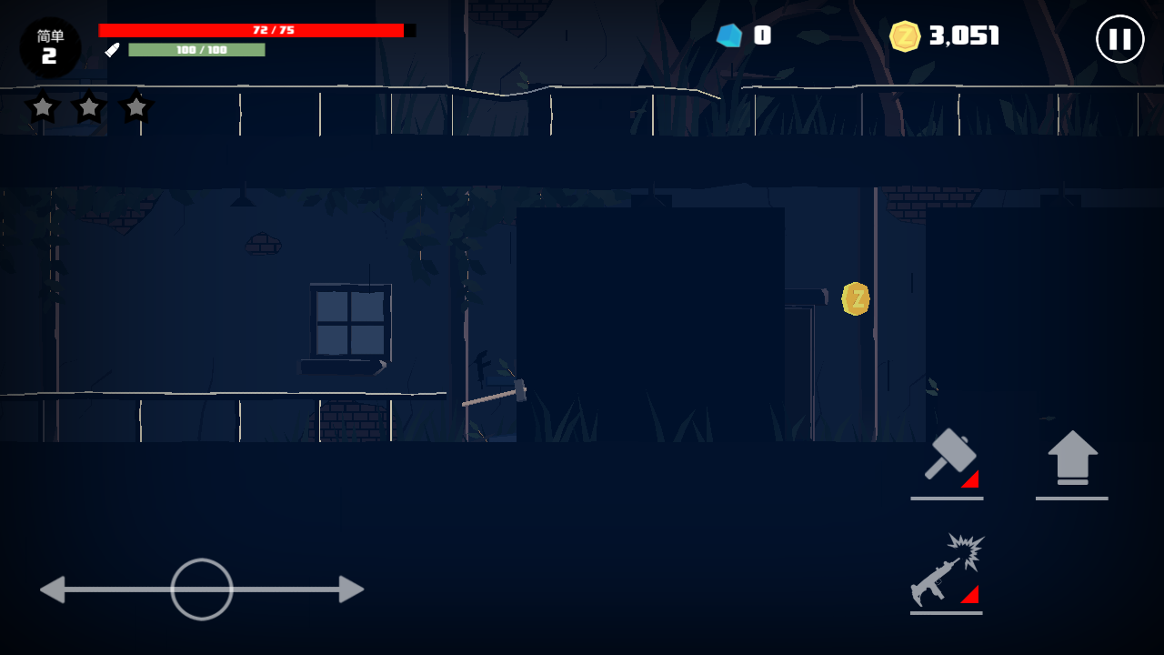 这游戏应该算是横版闯关跑酷类游戏吧。刚开始玩星星都加了武器,结果被怪群殴很容易死,后来就加了衣服上,很给力,加护甲高了怪打你一点都不疼。我后面就全加了护甲(少量血)和锤子,前面的关没有免控怪可以用电锤子,后面好多免控怪就换火锤子,虽然打的有点慢,但是稳的一比。不过难度一通关之后,后面还有三难度,就很乏味了。尤其是有的怪可以不管,但我就是想把他们打死,导致很浪费时间,最后都玩吐了。下面是我打最后一关