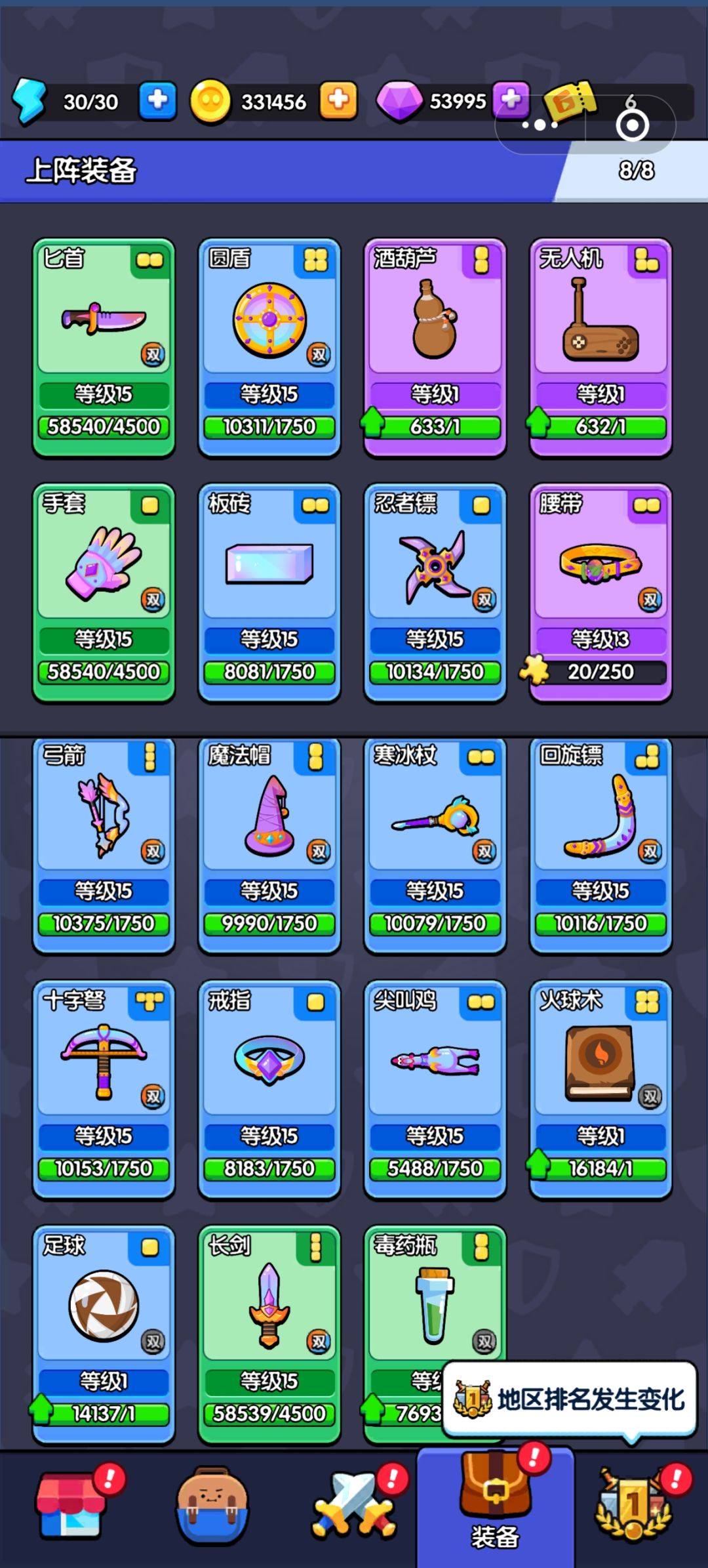 经过这段时间,又新增了不少武器和活动,这次主要介绍下武器类: 颜色分类:绿<蓝<紫<金(目前仅只有金箍棒,通过活动获得) 等级分类:单形态(1~4阶)<双形态(1~9阶) 攻击类型:魔法攻击、物理攻击(看各自的喜好)、防具(护盾类+回血类,一般必带一种,避免脆皮,被一下带走) 攻击范围:单体攻击(前期怪物数量少,打BOSS优势)、群体攻击(后期怪物数量多,这里推荐毒匕首和搬砖) 根据如上,选择高优