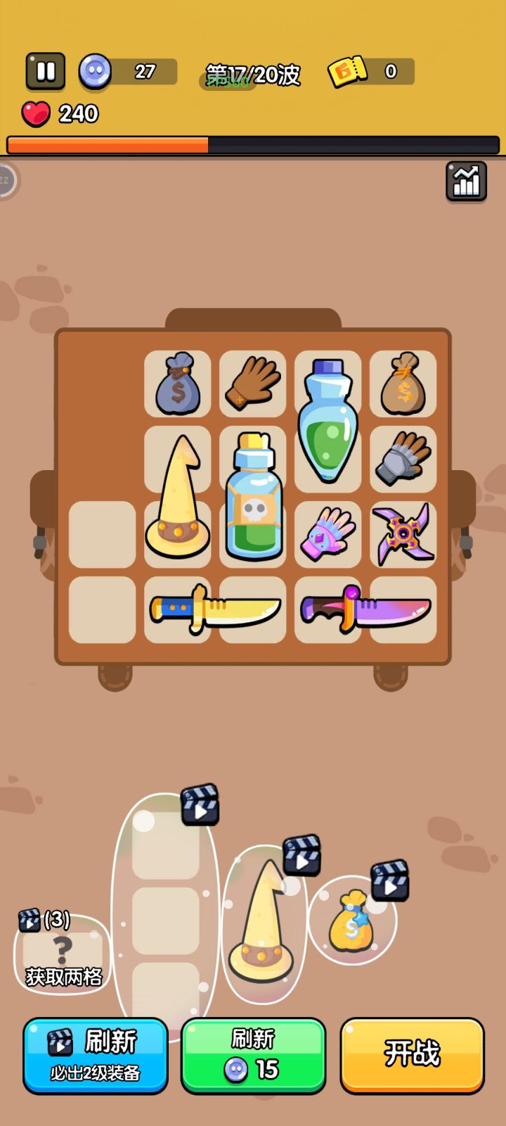 每日挑战共有10关,每天有一种有利BUFF和一种负面BUFF由于挑战关数限制,直接影响为银币数量少,对象装备平均等级低,那么就需要选择4级及之前更强势的状态这边优先推荐: 盾牌,手套,板砖,腰带,可以补上忍者镖,匕首,弓箭等输出(后面快速模式,随着时间增加,怪物的伤害持续增加,无上限,所以输出要到位)板砖技能有群攻,眩晕,击退,是目前1-4级武器里最强势的一个,必选