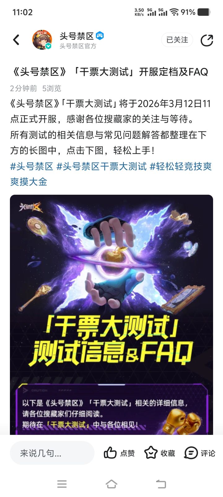 各位禁区的搜藏家们,久等啦!轻快俯视角竞技摸金手游《头号禁区》即将开启「干票大测试」!现在预约游戏,在评论区分享你的预约截图,并在评论区留下你们最想对我们说的话,(可以是鼓励、建议、甚至是吐槽),将有机会获得京东卡好礼哦~【活动时间】2026年3月5日11:00-2026年4月30日23:59【参与方式】Step 1:预约《头号禁区》Step 2:关注@头号禁区 并在本帖下方分享预约截图