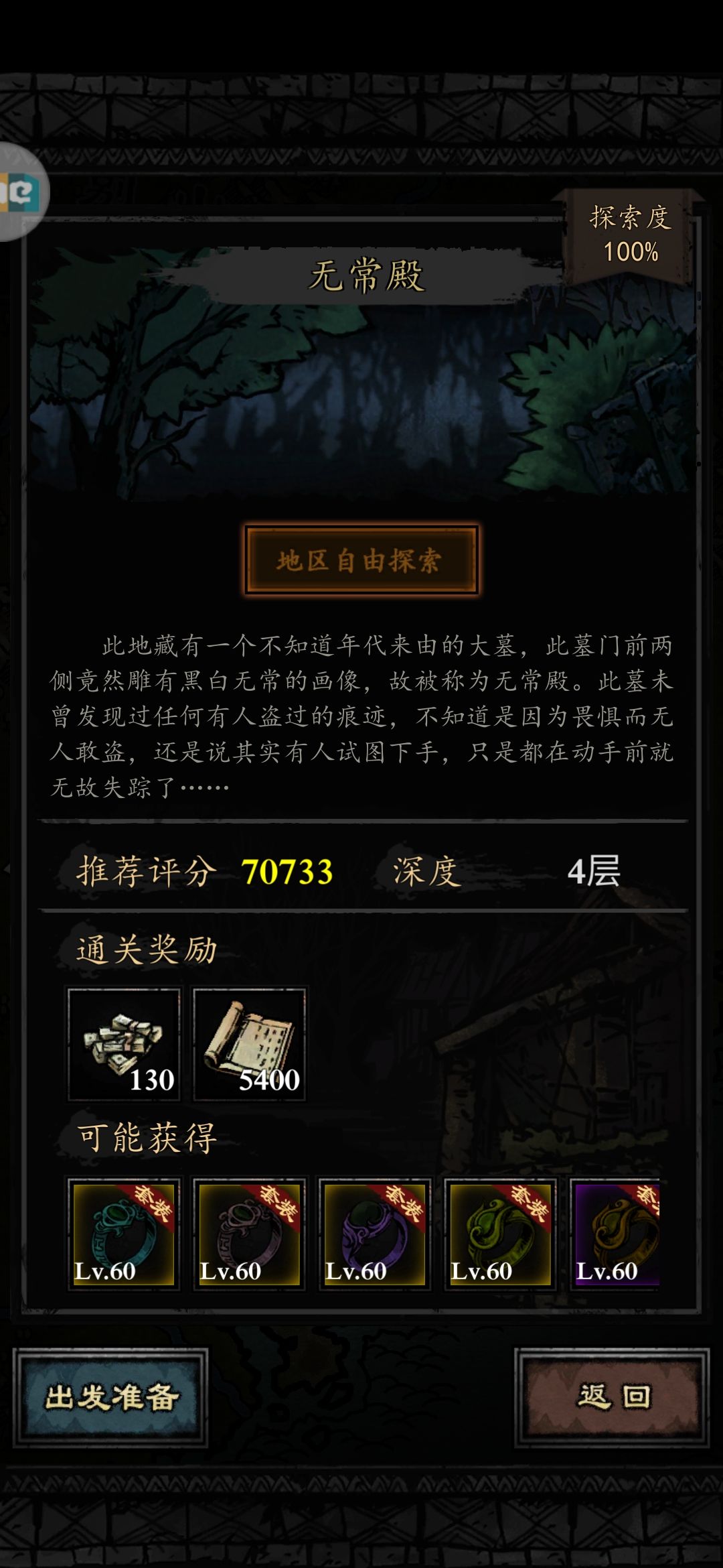 盗墓队名称:探险家10170718 账号ID:10170718 第六章分支,打造材料出处。与50级的差别不大,实力不自信的元良,刷50就可。 副本难度一般 队伍角色推荐,拥有群伤技能的角色为主,拥有位移技能的角色为辅(没有也行)。 武器:优先度刀类—剑类—枪类—手枪,榴弹枪不推荐。 道具:推荐红药,八卦,群伤符咒。定身之类的不推荐。 特别说明:过了50这个坎已经算是入门 ,路途小怪不再累述,相信各