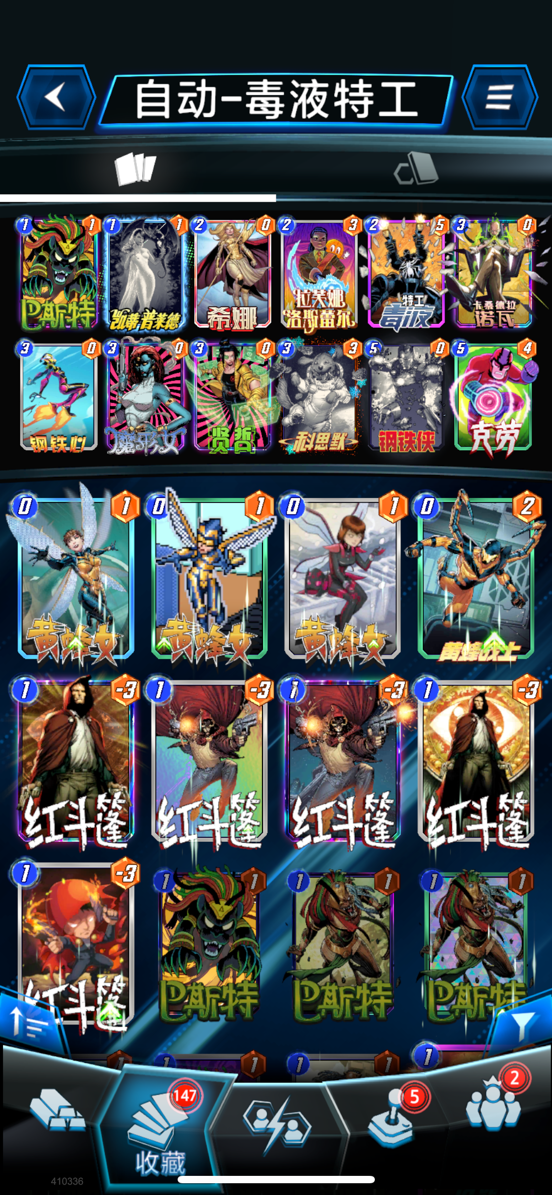 这个是以毒液,苏睿,宁录为核心的删除卡组,是通过苏睿加强宁录,然后使用毒液吞噬宁录触发被动,删除时再其他区域增加一张复制体,同时也让毒液继承一个区域的全部战力。 新星,阿美丽卡,巴基,卡耐基,金刚狼,魔剑客 毒液,死亡战士,苏睿,钢铁侠,宁录,万磁王