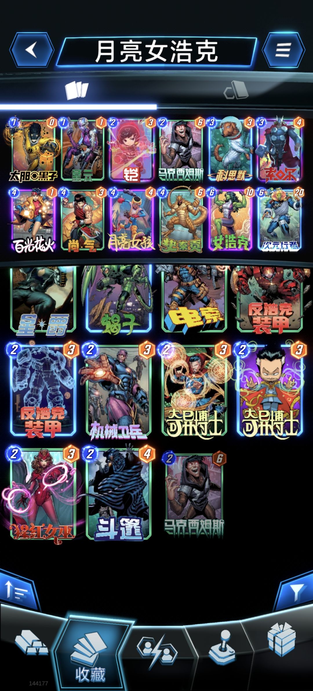 #漫威终极逆转 只氪了通行证,因为没出什么太好的体系卡,所以就东拼西凑搞了一套女浩克,虽然卡在7000不太好上分,但是玩起来很有意思,什么卡组都能打一打~ 一般思路就是冲两路战力,1费随便拍(没有小飞机只能带星云了),2费铠用来保1费或者大哥,或者恶心删去套。 马克西姆斯纯粹补充战力(可以换成女巫阴魔剑客) 狗很关键要捏死,一般用来反制王,海拉,奥创,如果感觉对手是这种卡组一定要捏住然后抢先手。