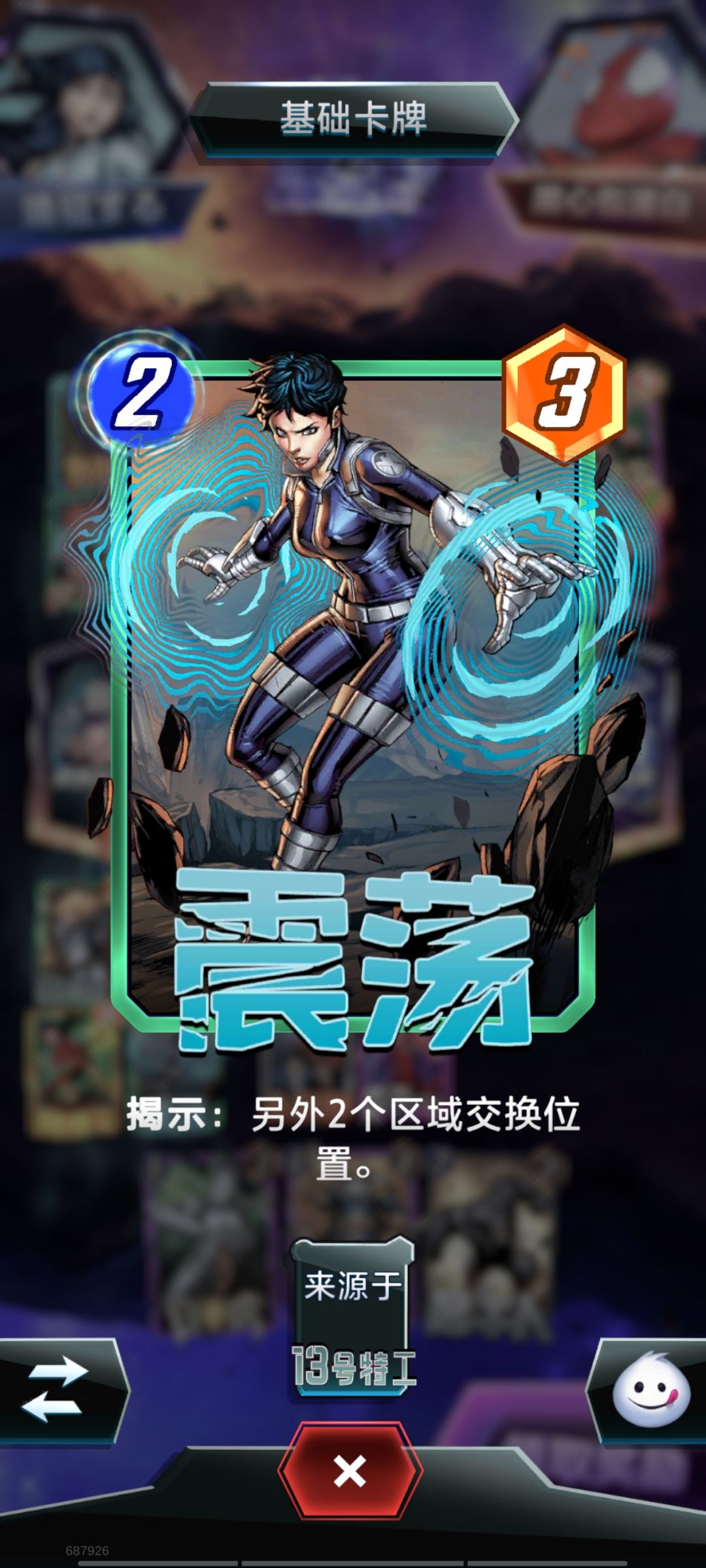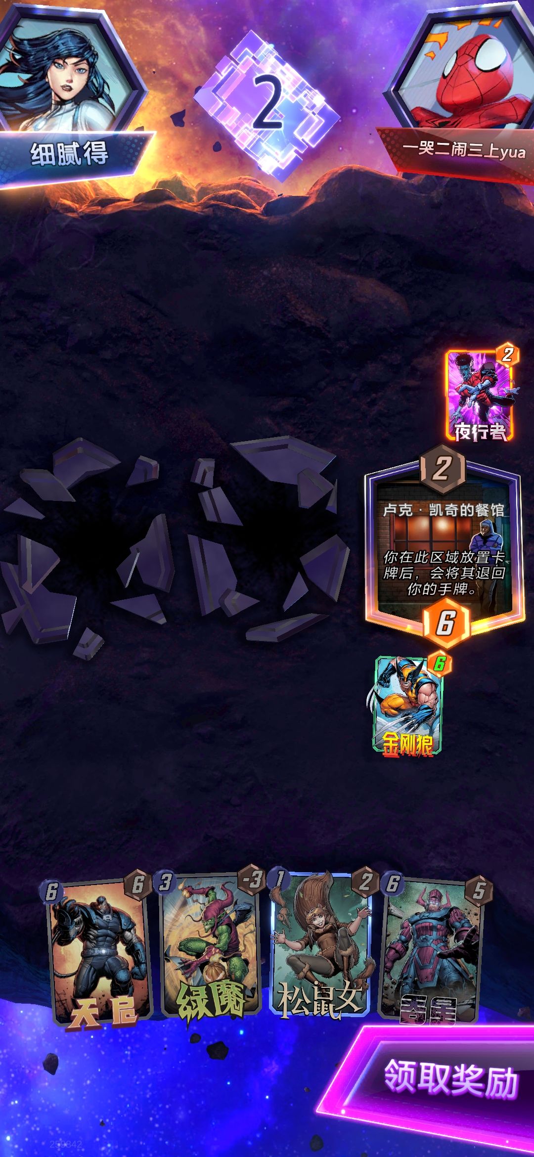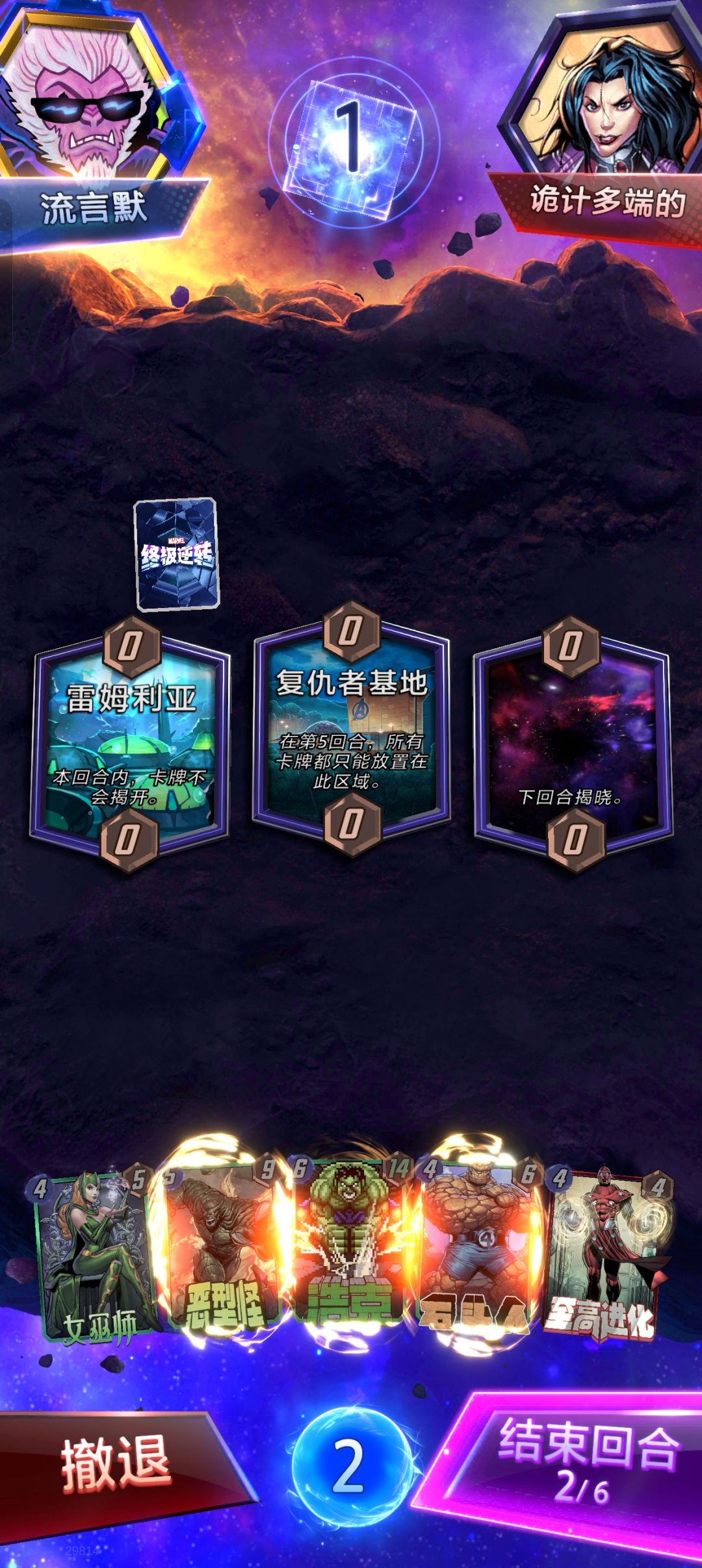 先介绍一下二位主角吞星和金刚狼的效果。 吞星:揭幕,如果你在该场地领先并且该场地你只有一张牌,则摧毁其他场地。 金刚狼:此牌被删除或丢弃后,随机出现在一个场地中并战力+2 中间场地随机给了吞叔,然后最右边场地把两边都卡住,导致我可以在第六回合安逸地拍下吞叔摧毁其他场地,但是吞叔会被场地效果返回手牌,那我该怎么赢呢? 没想到场地被摧毁后,该场地上的卡牌视为删除,触发了狼叔的效果, 再次复活在了仅存的