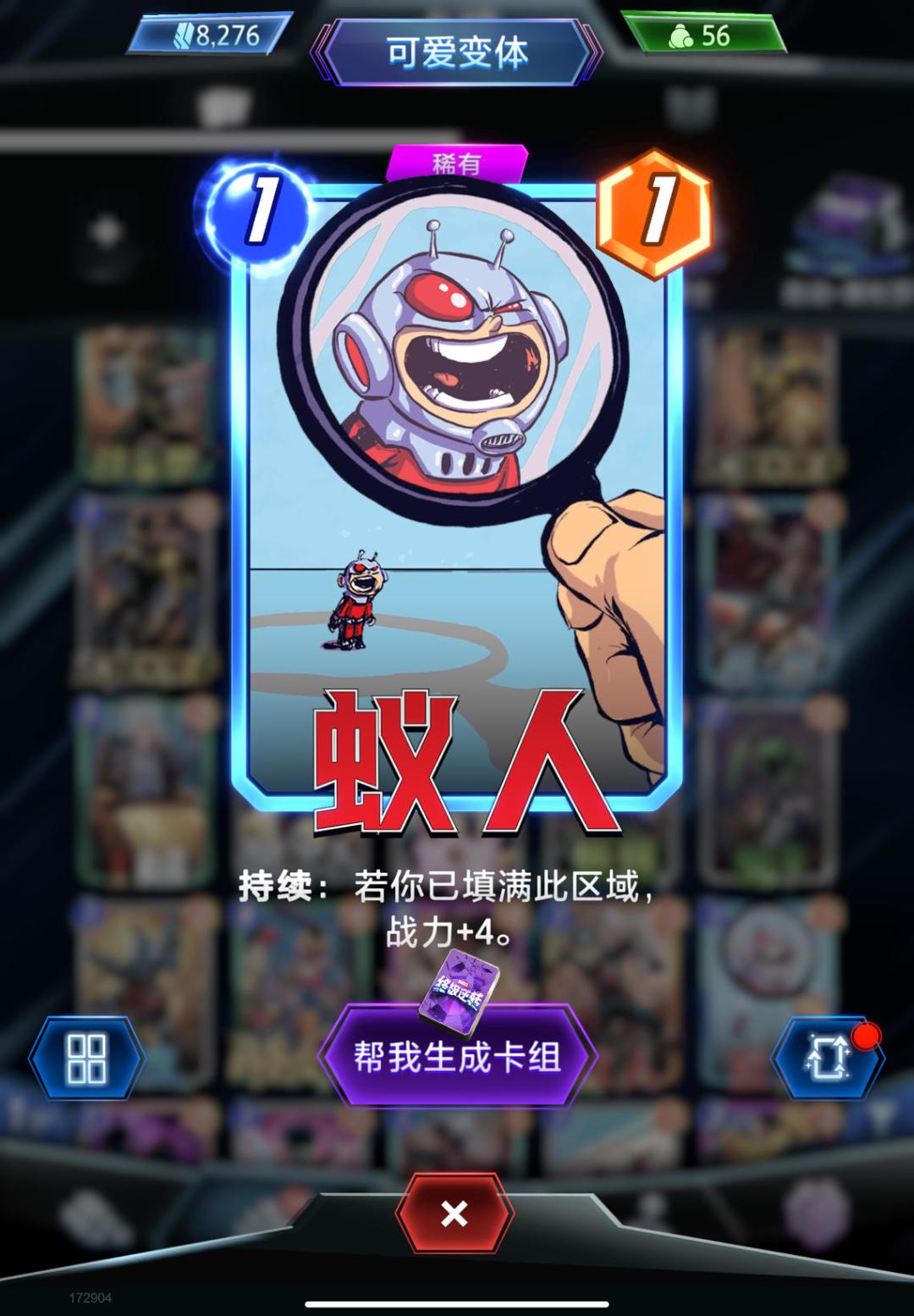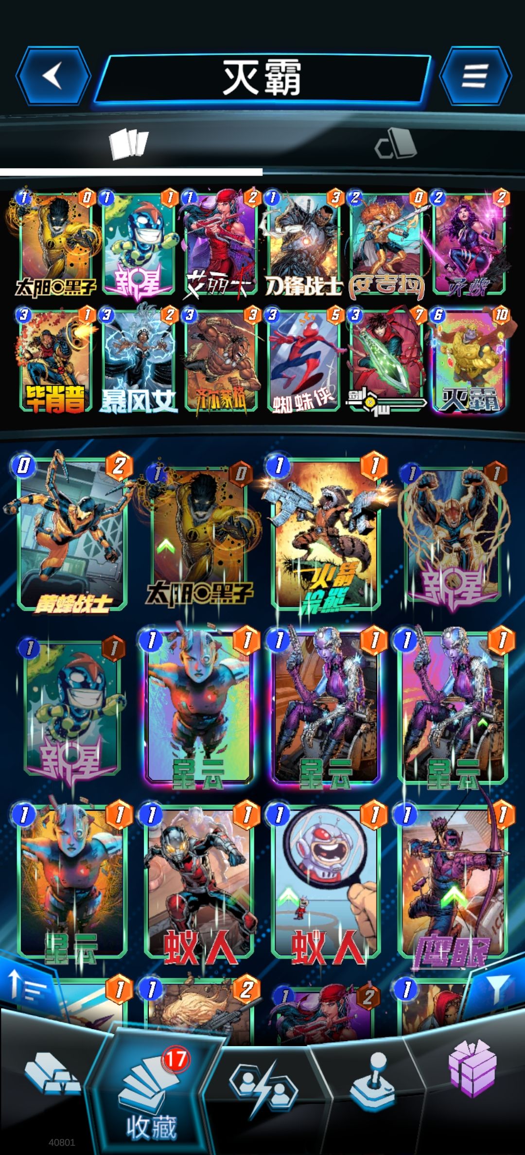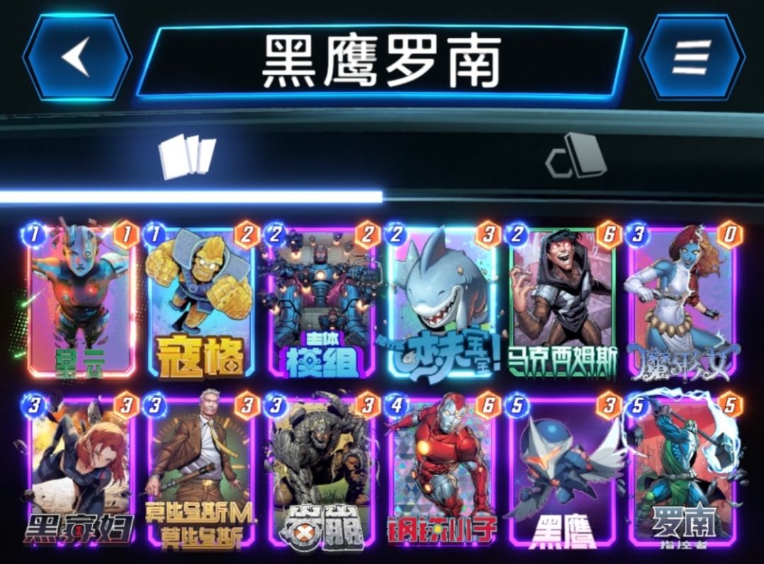 这套卡组核心牌当然就是灭霸,看过电影的都知道它是有5颗宝石的在游戏里面也一样,它是自带宝石卡片,然后他的宝石卡片都是1费,这个的话就会有一张卡牌跟他特别合,就是卡扎尔,这两个搭配起来就会发挥最大的效果,后面包括狂攻,这些都是补充战力的,剩下的可以根据实际的战斗情况进行调整。 蚁人,勇渡,魔剑客,超级斯克鲁人,卡扎尔,钢铁小子,交叉骨,钢铁侠,蓝惊奇,塞拉,狂攻,灭霸