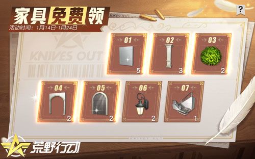 畅玩欢乐岛,打造你的秘密基地!《荒野行动》欢乐岛系统推出全新欧式家具装扮,为玩家们提供新颖的建筑风格选择。活动期间玩家可以免费领取多种欧式家具奖励。装潢升级等你来体验,快邀好友一同来建造吧! 【家具免费领 福利不重样】 1月14日至1月24日活动期间,玩家累计登录达到对应天数,可以免费领取D型欧式转角楼梯、A型欧式吊灯、欧式拱窗等7种欧式家具!每天奖励不重样,欧式家园随心建造! 【家具欢乐兑 独特