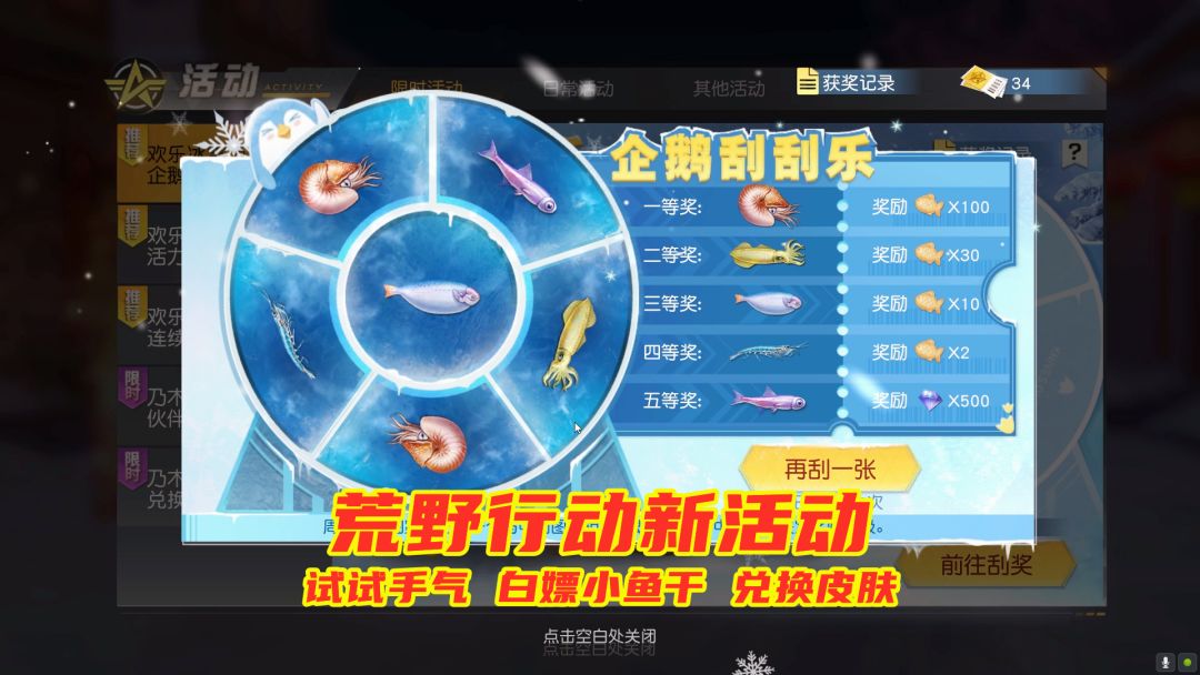 荒野行动:冰雪节新活动企鹅刮刮乐,免费刮奖领小鱼干,兑换皮肤