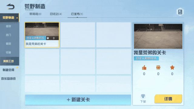 全新一期的优化计划来啦! 荒野制造正式开启蓝图工坊 新增“连射狙击强化模组”配件 皮卡类载具货舱新增车载机枪位置 下面就由天命妹给各位荒友详细解读~ 荒野制造新玩法全新上线! 蓝图工坊正式开启~ 荒友们在发布地图时 可将自己的地图同步至蓝图工坊 在创建地图时 大家可以在蓝图工坊选择 其他玩家同步至蓝图工坊的地图模板 突破制作门槛,最大化实现你的创意! 和各路大神们一起集思广益 二次创作来自不同