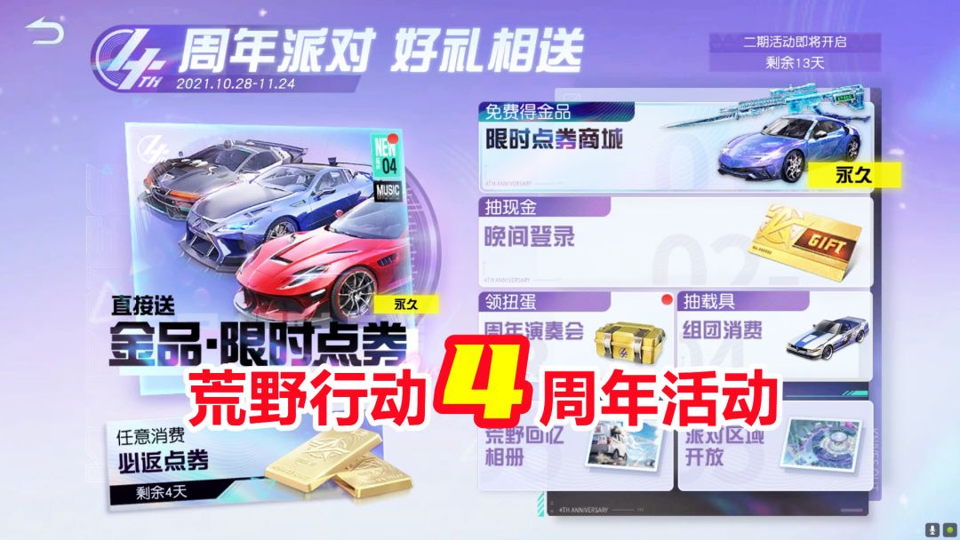 荒野行动周年庆特惠活动!点券商店超多礼包,还有周年主题曲来袭,荒野行动4周年:周年庆特惠活动,限时点券搏一搏直接出金车!
