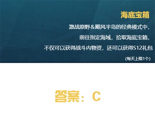 假期即将来临为了检测各位荒友对游戏的熟练度补漏王出了一份暑假前的小测试大家快来一起看看吧~【一.选择题】1.炎炎夏日,大家都前往指定海域潜到海底探寻海底宝箱,不仅可以获得战斗物资还可以获得S12礼包。荒友们知道以下哪张经典模式地图没有海底宝箱吗?A. 激战原野B. 飓风半岛C. 都市阵线2.荒友们都知道荒野竞速中第一个冲过终点的玩家获得第一名,那么当第一名产生时其他玩家将会开启_