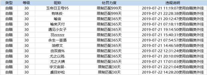 亲爱的荒野精英们,本期封禁名单主要根据违规类型(透视、自瞄、无后坐力),展示了部分近期违规的高等级用户。部分用户违规情节严重,被处罚限制匹配999天。同时也有部分玩家初次违规,被处以限制匹配7天的警告。希望玩家们能够继续向我们反馈和举报外挂,共同维护游戏的绿色环境。请各位玩家们相信,为了让大家拥有公平的游戏环境和更好的游戏体验,荒野行动运营团队始终秉持严肃严谨的态度,对外挂保持零容忍态度,一经