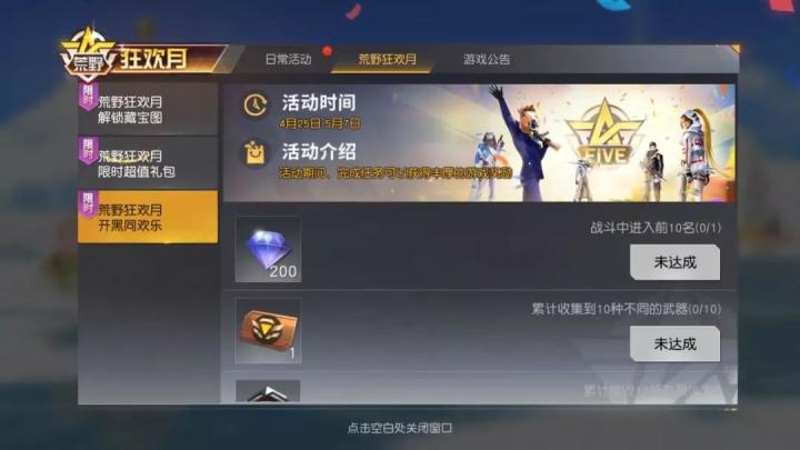 荒野行动狂欢月,正式拉开帷幕多重游戏福利,均已空降狂欢月现场。就等荒友们收入囊中激情五月,狂欢不停让补漏王带你们一起迎接各种砸脸福利嗨翻荒野。八大福利齐空降空投洗脸嗨不停每日登录游戏领取开黑宝箱即日起至5月7日,完成游戏内开黑任务可以获得丰厚的游戏奖励。在战斗中达成累计收集10种不同武器、累计摧毁10辆载具、进入前10名等任务,都可获得相对应的奖励。累计参与十次战斗、与好友完成十次组队开