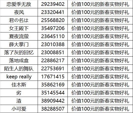 中奖名单:恭喜以上玩家获得活动奖品,请于2019年2月24日18:00分之前主动联系登记工作人员QQ:3296362628提供中奖信息(请根据管理员qq空间规定的格式提供),以防因QQ离线漏掉信息,麻烦各位中奖的玩家一直联系到工作人员回复已登记为止哦,一天联系一次即可! 如未在规定时间内未有效提供信息将视为自动放弃领奖,后续不作补发,请熟知~!!各位荒友们,还有不到半个月就过年了,心情激动不