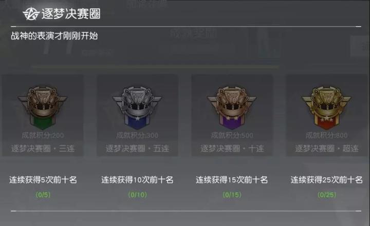 补漏王经常听到一句话。比赛嘛,不赢多没意思,我觉得很有道理。但是赢得太简单,岂不是没意思?最近更新的成就中就有许多充满挑战性的任务,补漏王贴心地给大家附上了锦囊让我们一起来看看吧!↓↓↓01逐梦决赛圈成就介绍第一个成就需要荒友们稳!它可以说是低配版的“连胜”成就,因为它要求我们连续进入前10名5、10、15、25次,虽然只需进入前10就行,但是最高等级的成就需要连续25次,难度还是非常