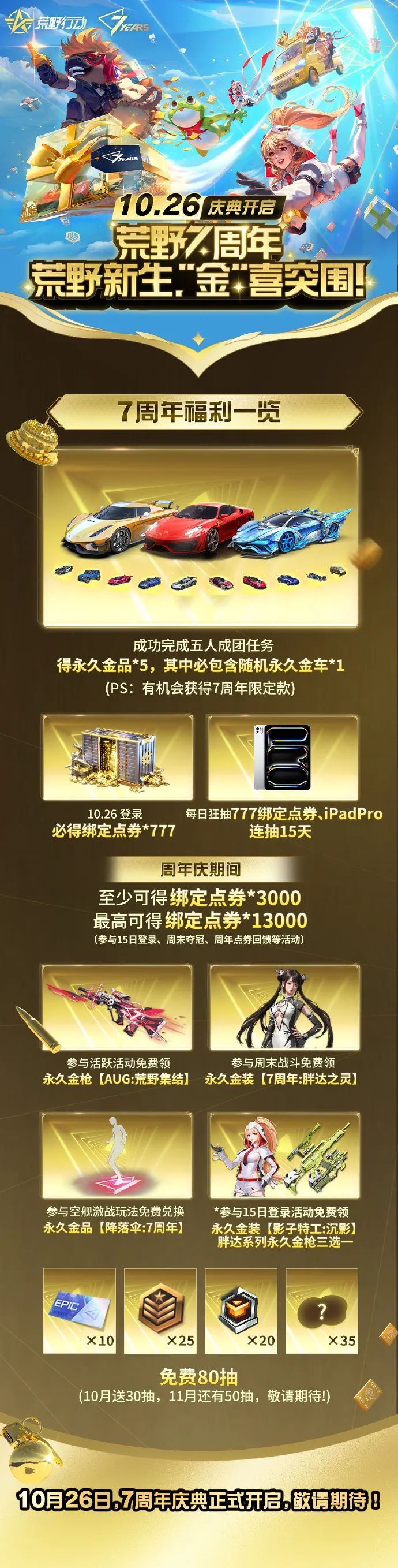 起猛了,金车说送就送?咱荒野也是出息了!告诉俺娘,俺不是孬种,俺也开上豪华金车了!10月26日,荒野7周年,史无前例的免费金车,人人都能有!10月26日~11月10日,邀请你的好厚米五人组队游戏,必得免费永久金车!而且荒弟可是听说了,这次的金车还不止一款哟~~还有全新7周年限定款加入奖池!周年倒计时,10月26日,我们一起上线提金车!高清无码福利已解锁到第三张,荒友们就说喜不喜欢?在评