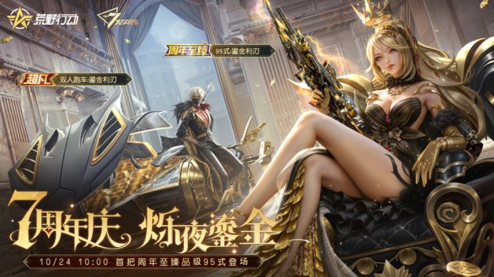 郑重跟大家说一声对不起,现在才把7周年限定军需端上来,是我们藏得太深了。大家期待已久的七周年限定军需【烁夜鎏金】即将上线!10月24日10:00,和荒弟一起登录荒野,做土豪、撒金币!周年至臻【95式:鎏金利刃】首把周年至臻品级95式,黑金配色尽显奢华之感,透明的设计使枪身内的金币一览无余。将枪械升级至至臻品质后,不仅能解锁诸多酷炫特性,而且每把至臻【95式:鎏金利刃】还能拥有专属编号,都是独