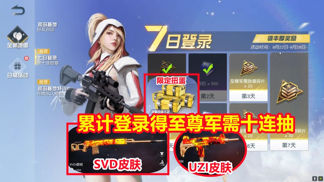荒野行动新活动!累计登陆领至尊军需十连抽!荒野行动:新地图新活动!累计登录领至尊军需十连抽,枪械皮肤等,荒野行动新活动得至尊军需十连抽!参与活动免费领枪皮,限定扭蛋