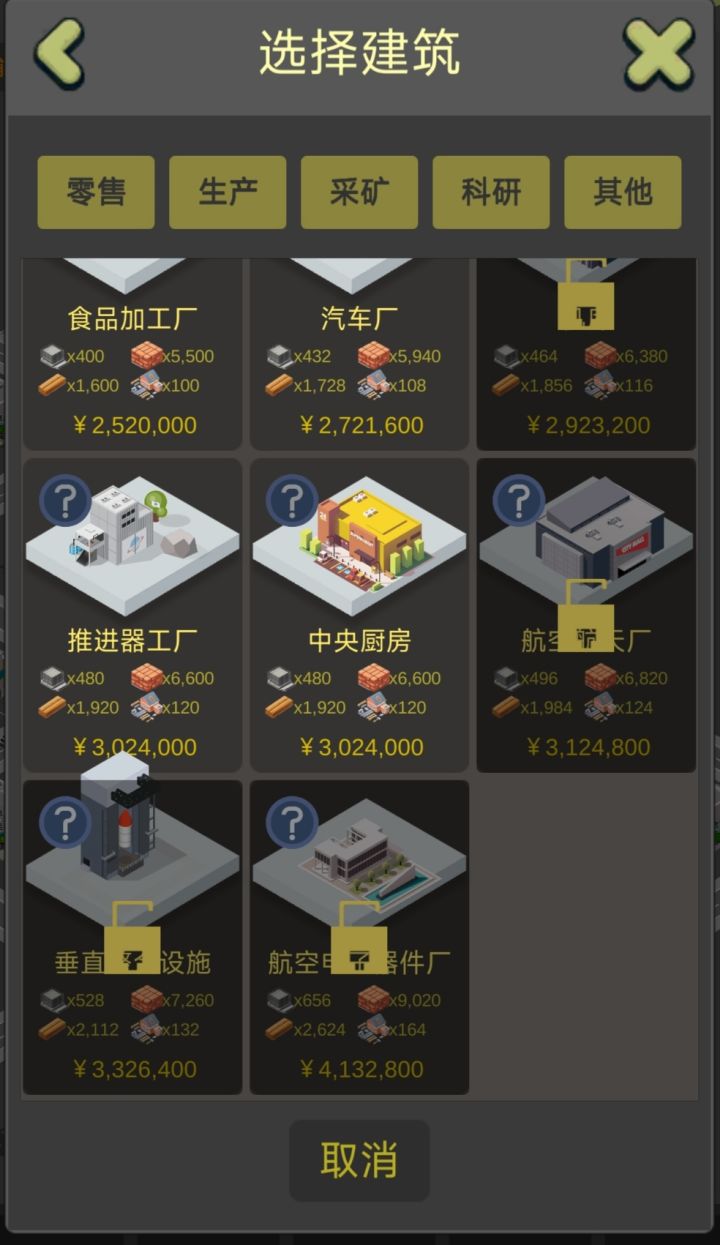 开局跟着教程走完剩下几千万,这时候不要急,不要想着一下子弄到几个E,1,什么是贷款,使用银行功能可以快速贷款积累资金,每天都可以贷5000W,利润绝对大过负债,放心贷,首先在所有空地上建造高价值建筑用来提升贷款额度,贷款额度用完了就可以拆掉无用的建筑物(例如,厨房,材料加工厂,车行等)。2,等本金弄得差不多了,开始选择行业入行,建议开始种田,生鲜零售,服装销售,纯生产可以挂建筑自动出售功能比较