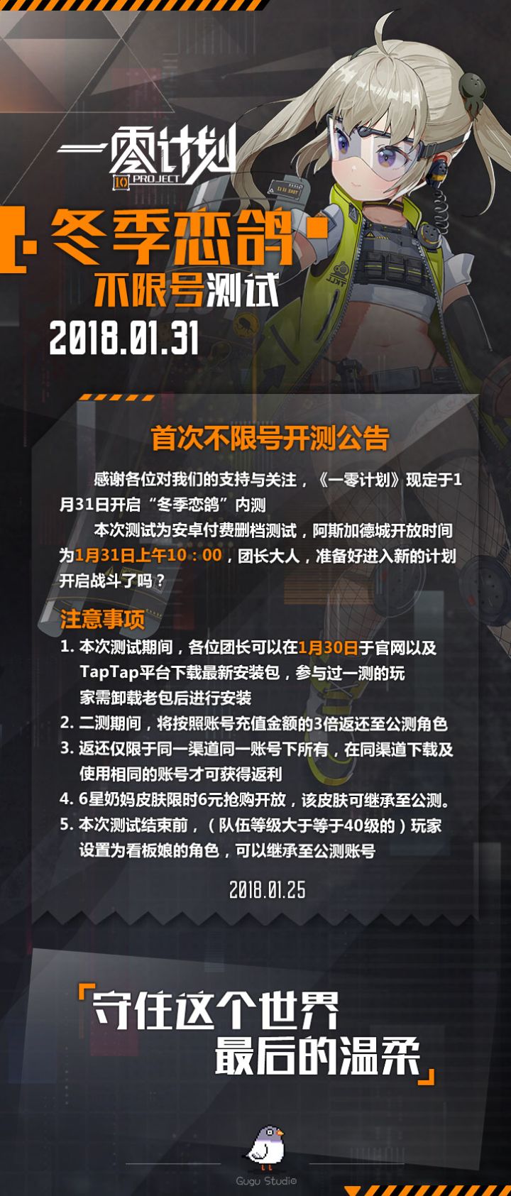 感谢各位对我们持续的支持与关注!《一零计划》现定于1月31日开启“冬季恋鸽”测试!本次测试为安卓付费删档测试,阿斯加德城开放时间为1月31日上午10:00,团长大人,准备好进入新的计划开启战斗了吗?有关更多测试以及返利详情,将在后续公布的公告中进一步说明~■独特塔防玩法、超多英雄听任你的命令■指挥专属队伍、多种超难关卡待您攻克■在炮火的映衬下,与甜美的她亲密度UP■轻松养成,点缀您的冒