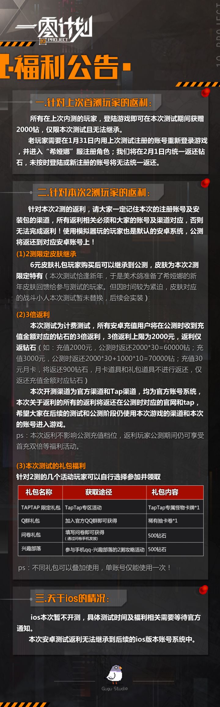 测试说明&福利公告测试时间:2018年1月31日上午10:00-2018年2月9日下午17:00下载地址: 1月30号晚上开预下载(鸽)测试系统:安卓建议机型:2G内存以上由于本次测试属于技术性测试,游戏内容及玩法尚在开发中,版本内游戏品质不代表最终游戏品质,故在游戏中发现任何bug或者任何修改性的建议,请于移步企业QQ800823968和Tap论坛进行反馈。另外为了避免大家的热情导
