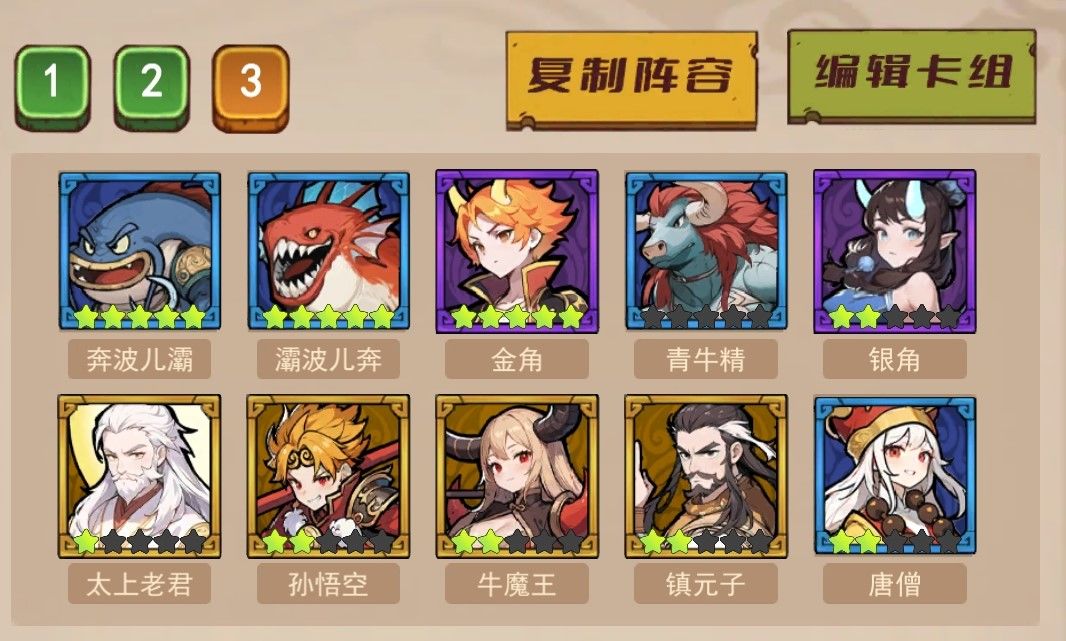 阵容代码: [16,17,19,25,24,20,9,21,26,12] 简要说明 先上奔波霸和波霸奔,如果等级低打不过小怪可以先升几级。然后开格子上金角银角和老君获得额外加钱。再上猴子破隐身,然后上虎力大王,开始升级金角银角和虎力大王,把等级高的集中在一个角落让输出不至于太过于分散,再补个鹿力大仙。18回合卖猴子换镇元子提升金角等级上限,再卖镇元子换成牛魔王凑五妖王。切记19和20回合一倍速打(