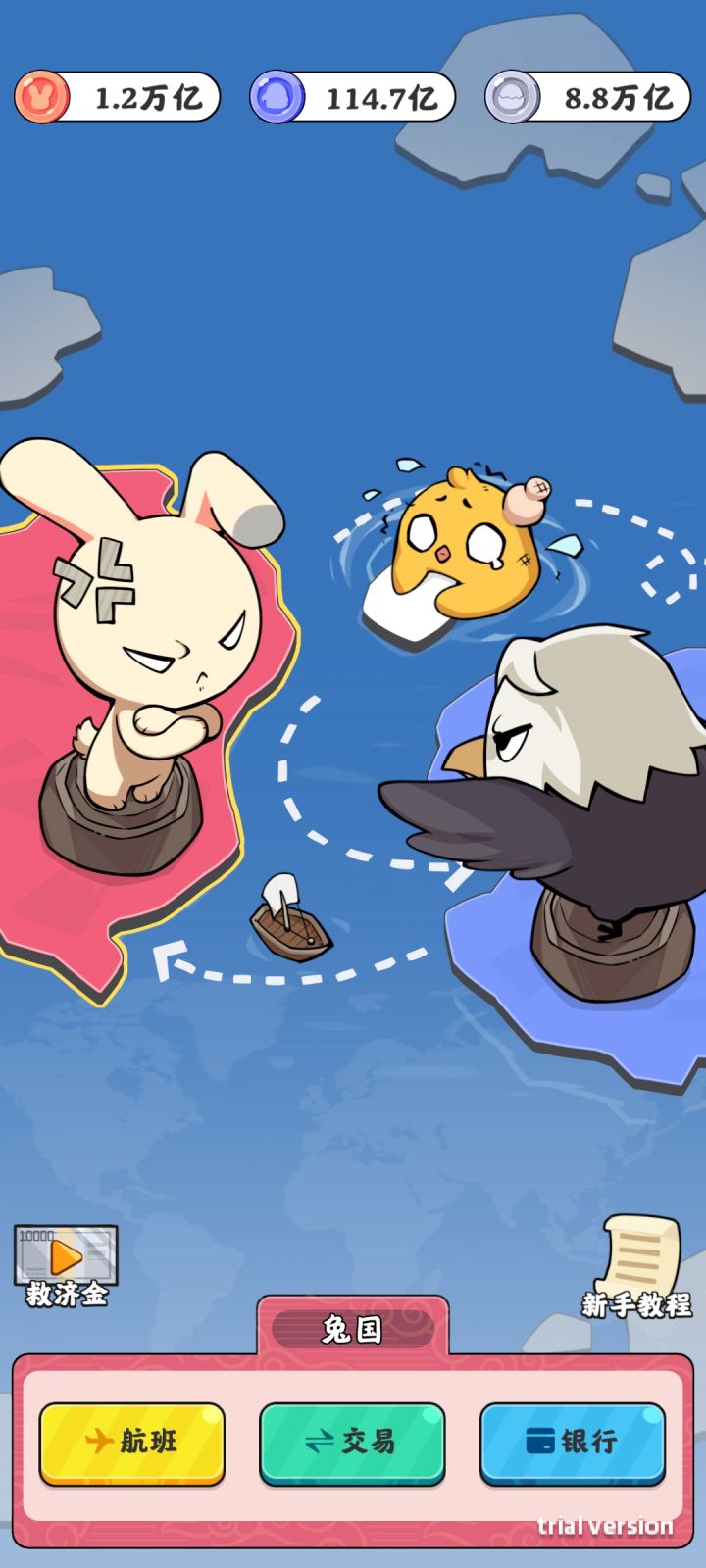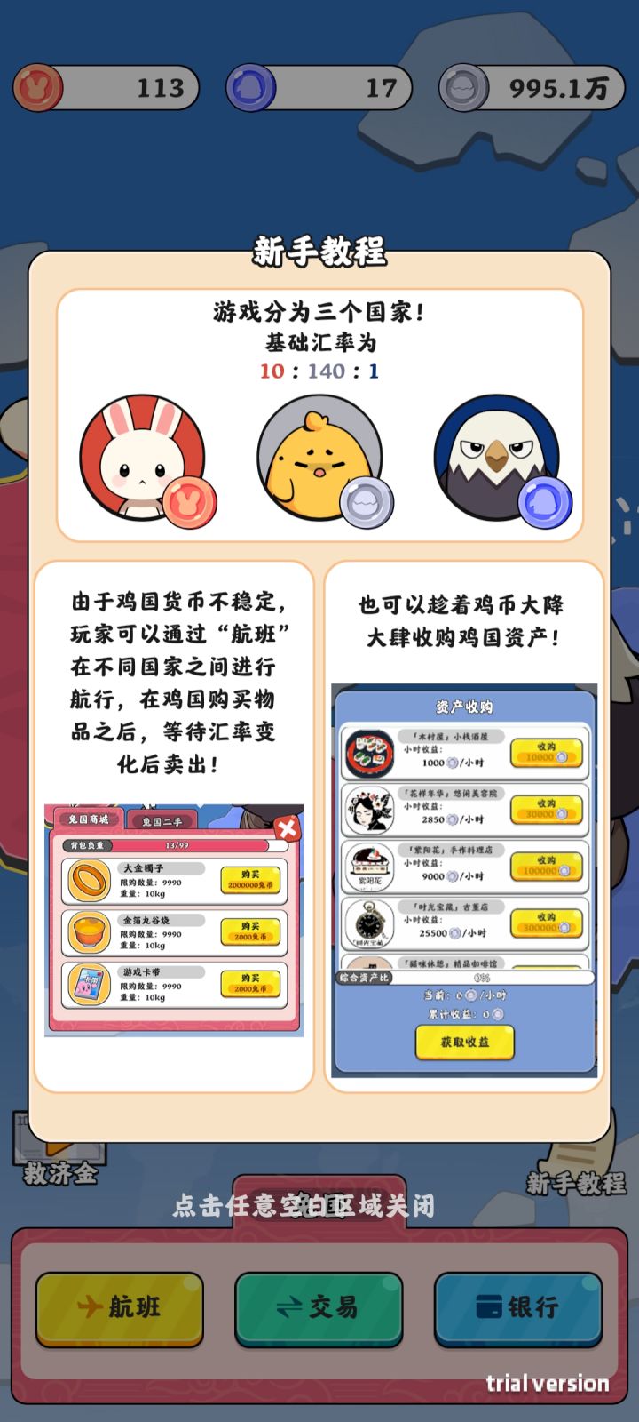 玩家需要周旋在兔兔、坤坤、鹰酱之间,从坤坤那边买奢侈品篮球,啊不,奢侈品,然后在兔兔这边以恒定价格赚取差价,兑换货币差价后购买资产就可以挂机了,至于把钱存到鹰酱那边,如果不想崩溃不建议这样做。
