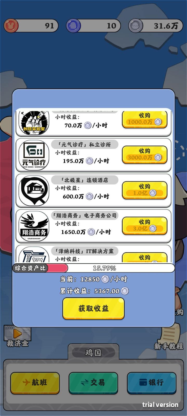 刚上来啥也不懂,买票去了鸡国,然后直接卡关,因为去之前没有换鸡币,而去了之后所有操作都需要鸡币,而鸡币在鸡国是无法兑换的,其他的包括机票,资产等等,emm,建议改一下,或者开局提醒,或者强制换币