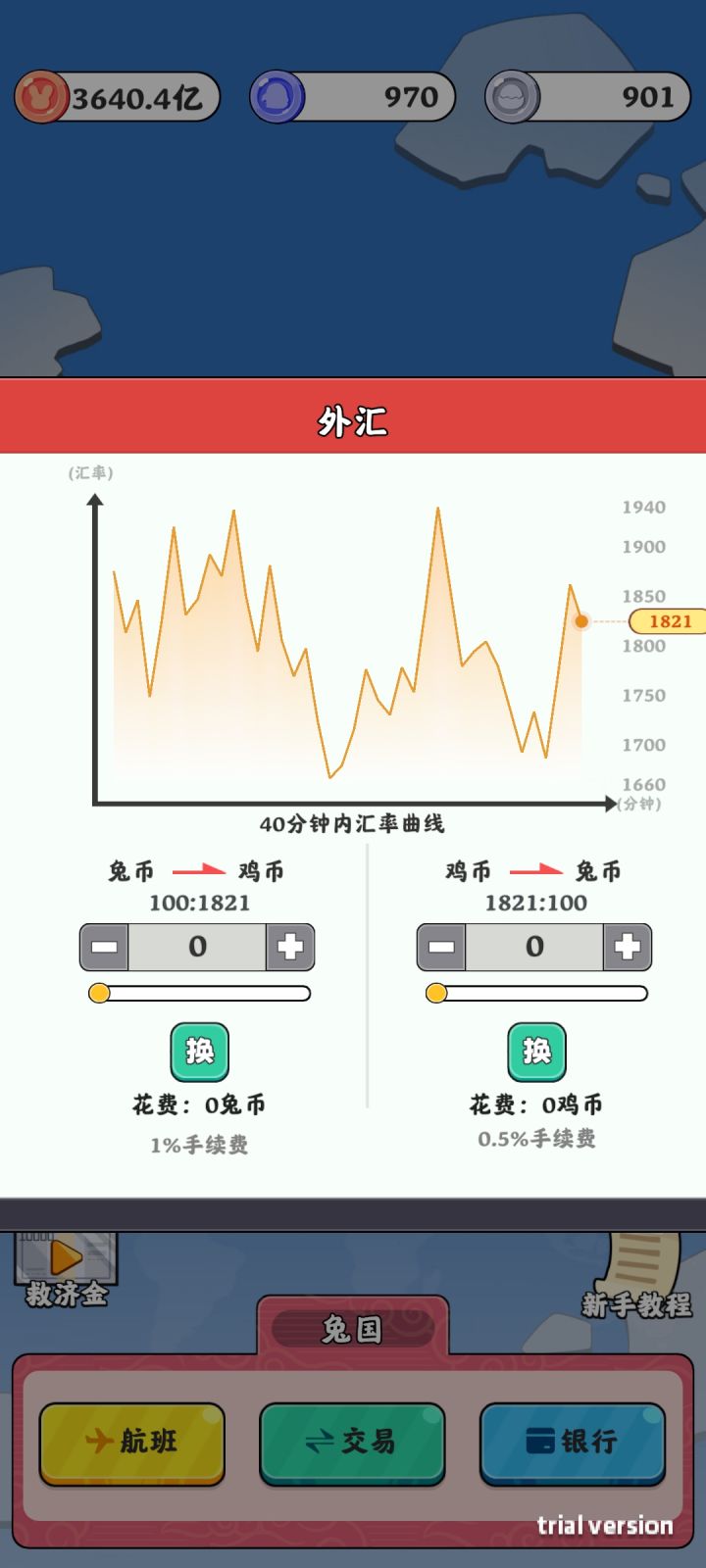 Ok,分享bug,我发现官方这个bug还没有修复,帮祝们早日通关。!首先,你换任何货币都可以,至少鸡币和兔币可以互相卡的。把想卡的货币兑换兑换为零就行,那你是存银行还是去兑换都可以,一定要变成没办法兑换了为止。我这边遇到两种情况卡出,一个是在兑换前搞上搞一个零,然后在后面随机输入一串乱的数字,要很大。随便乱输,就是你直接输入一串随便很大的数字就行。然后再点确认,看他有没有前面加负号,加了负号就卡成