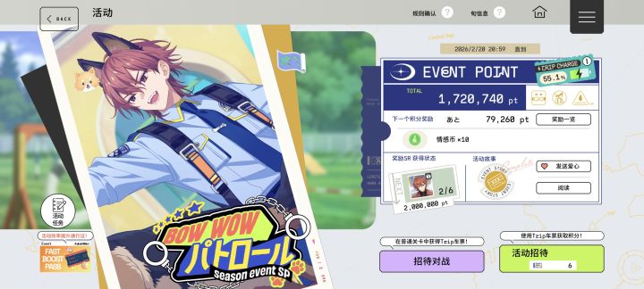 一个普通sr活动好肝,这期加成卡都抽了只是SSR没叠卡而已,根本肝不动,满pt是500w,我第一天游戏开始四个小时就开干,现在还没开始碎钻但是已经肝不完了😢只能庆幸这次称号不是我推的门面,日游真的又肝又氪我好心累