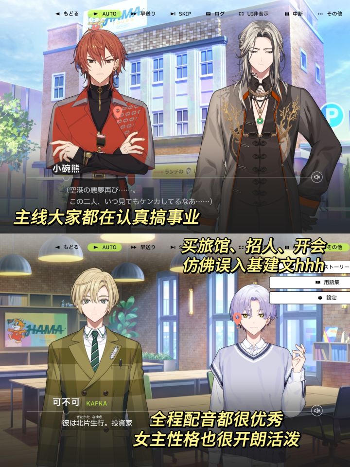之前安利的18trip上线两天啦,玩了两天之后我的感想就是:求求你快出国服吧,我真的很想玩中文版的!首先游戏画面超级好看,人物每一个都很好看,UI设计很美还很贴合主题,过场的播片也做得很好,音乐是青春阳光那一卦的,看得出经费很充足,玩得我尸体暖暖的开心游戏的剧情全程配音,而且大部分都很贴脸,女主的声音更是活泼开朗,超级可爱!主线还真的就在认真搞事业!大家聚集起来开公司招人