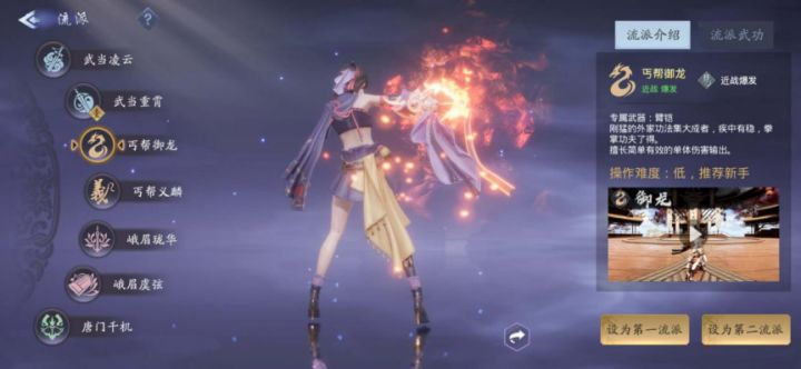 丐帮:丐帮自古就被称为第一大帮,盖天下历朝历代无有不沦为乞丐之人,丐帮弟子聚伙帮打抱不平。在剑歌行中,丐帮多为近身战高手,拳法棍法出众,而丐帮弟子也是个个义气非凡,逍遥自在。 丐帮流派:丐帮流派分为御龙和义麟。御龙流派为近战爆发职业,专属武器是臂铠,乃是刚猛外家功法的大成者,疾中有稳,擅长拳法掌法进行近身单体伤害输出,给予敌人致命打击。操作难度低,适合新手玩家使用,是主打