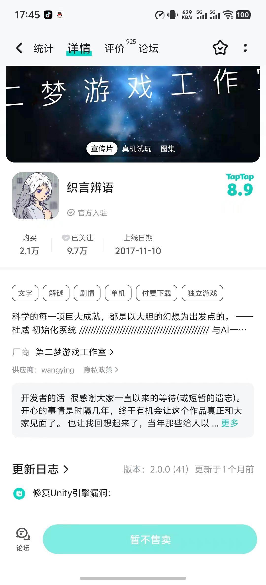 各位梦想家们不知道已经度过了多少个日日夜夜,宇宙更替时光轮转我们大家可能已经从小朋友变成大学生已经从小青年到为人父母已经从青葱懵懂到不知所措(玩笑)而《织言辨语》终于可以与大家见面了几天前,已经与大家约好四月见面,也陆续收到了梦想家们的祝福这里,回答几个评论中的问题1-游戏是买断制,无内购2-首周售价6元3-4月15日0点即可下载感谢大家一直以来的等待与耐心,虽然预约数量不